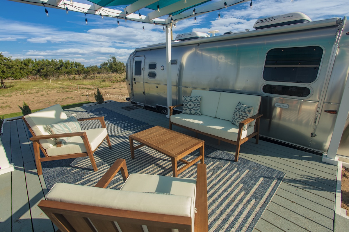 Burn ban in effect as of 2/2/2026. No fires allowed. Experience Fredericksburg and the surrounding wine country while staying in this iconic American Classic. The 2021, 27ft Flying Cloud sits on 10.5 acres, 8.9 miles from downtown Fredericksburg and 8.5 miles to Enchanted Rock. With the main house and one tiny home on the land you can enjoy your time here with parallel peace and privacy while enjoying nature and not sacrificing on luxury.