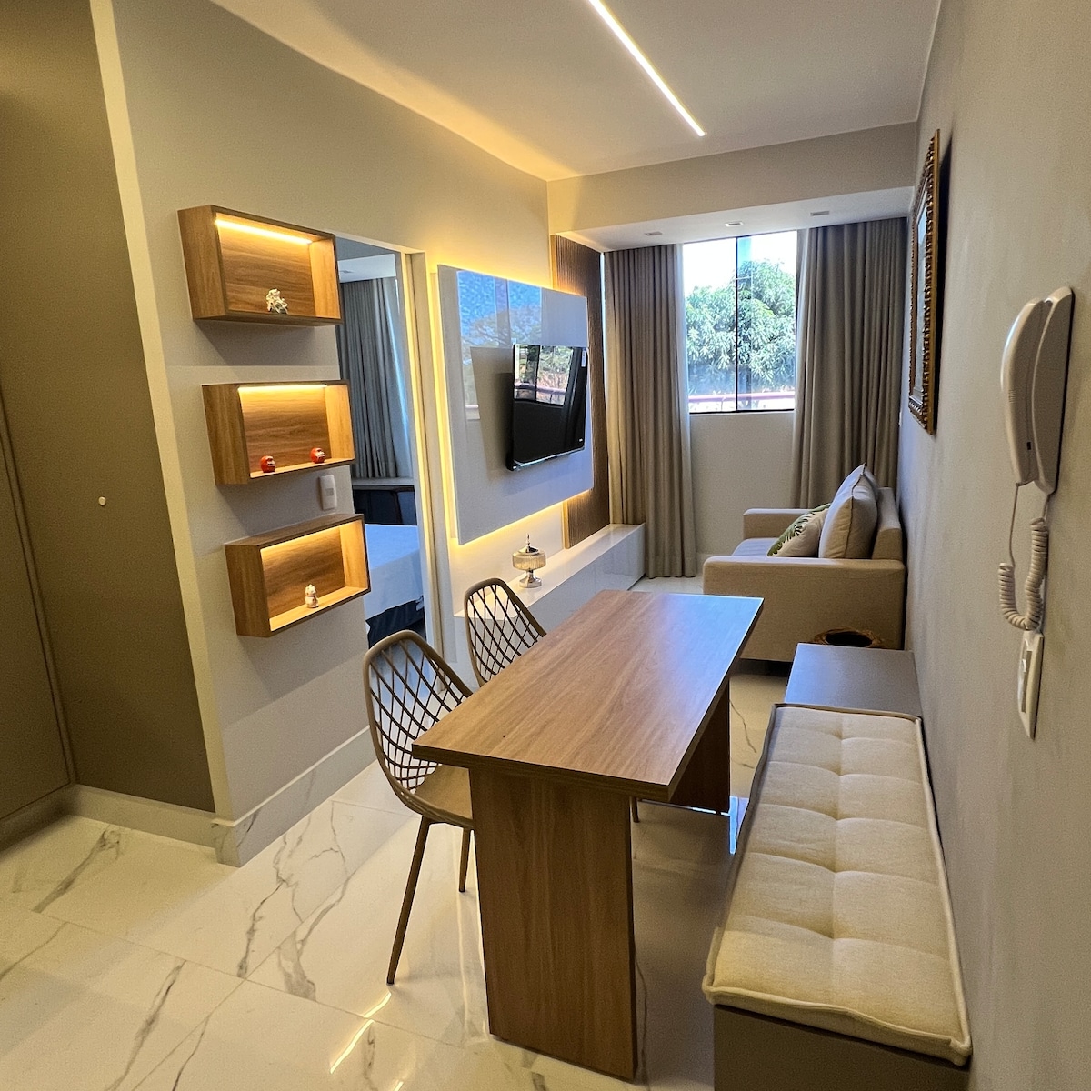 Nikmati studio ini, yang dirancang agar para tamu mendapatkan pengalaman yang luar biasa. Studio ini ideal untuk menyambut 1 pasangan dan 1 orang. Dengan luas 30m2, maka akan memiliki: - TV dengan saluran; WiFi; Tempat tidur sofa; Tempat tidur queen; Pengering rambut; Pakaian tidur/kamar mandi; Ruang kerja; Kulkas; Microwave; Oven listrik; Setrika dan setrika/Lava dan Papan kering; Sangat dekat dengan pusat perbelanjaan, restoran, Parque da Cidade dan Parque do Bosque, bar, bioskop, rumah sakit, dan Esplanada dos Ministérios.