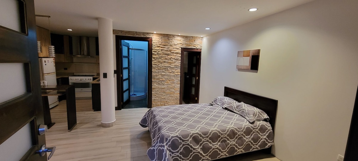 Disfruta de una experiencia con estilo en este alojamiento céntrico. El departamento está ubicado en la parte central de la ciudad en el segundo piso del edificio, se encuentra a pocos minutos de parques, bares, cines, mercado etc. El Espacio: La habitación es acogedora y tranquila con conexión gratis de wifi las 24 horas, con una elegante sala y con un cómodo sofácama. El departamento tiene acabados de primera con una excelente vista a laciudad.