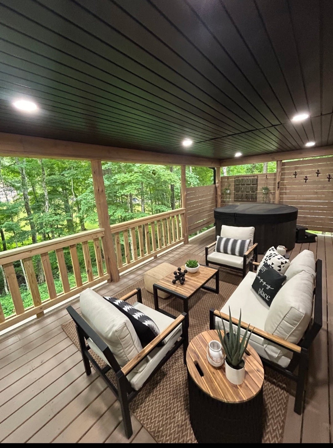 Experience top notch accommodations in a NEW, 2025 cabin in the woods just 5 minutes from Dale Hollow Lake State Park resort and marina. This home boasts an oversized covered deck, private hot tub, comfortable outdoor seating/dining, and a Webber gas grill for the ultimate in outdoor living spaces. You’ll also find an outdoor fire pit with more room for gathering after a day on the lake, and there is plenty of parking for vehicles and boats.