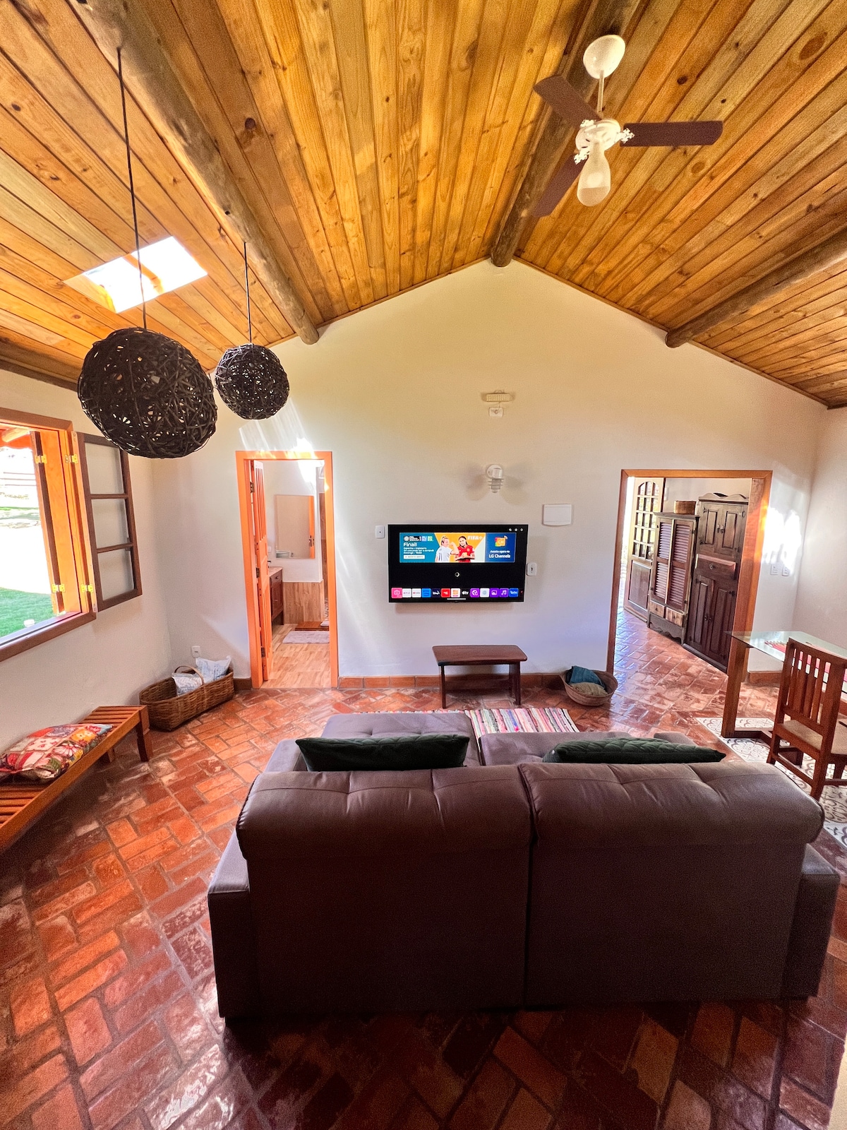 Ini adalah pondok yang menawan, dengan batu loncatan di atas kolam ke pintu utama, lantai bata pedesaan dan kayu. Tempat ini memiliki meja bundar besar, ruang tamu dengan 1 tempat tidur single dan satu tempat tidur double, dan dapur kecil. Ada kamar tidur dengan kantor, kamar mandi lengkap, bak mandi, lemari terbuka. Pintu geser terbuka ke teras tertutup dengan kompor penuh. Ada suite lengkap lain yang terbuka ke patio belakang. PENTING: harga yang diumumkan mencakup 2 tamu. Biaya tambahan sebesar R$ 30,00/malam per tamu tambahan berlaku.