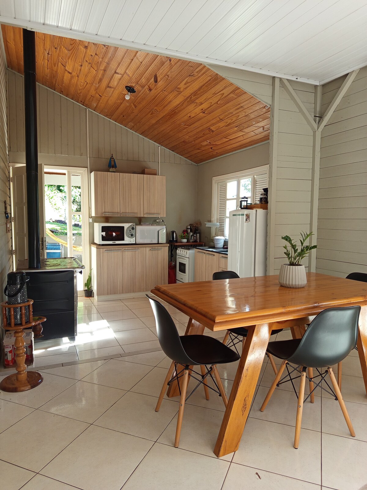Chalet lengkap, nyaman, dan dikelilingi oleh kehijauan. Ideal untuk pasangan, keluarga, atau mereka yang mencari hari-hari tenang dekat dengan alam. • Kamar dengan tempat tidur double. • Ruang tamu terintegrasi dengan TV, sofa bed (muat 2 orang lagi, lihat harga) dan perapian. • Dapur lengkap. • Wifi. • Balkon dengan hammock horizontal. • Area luar ruangan dengan ayunan dan lubang api. • Kontrol iklim. • Bak mandi air panas. • Seprai dan handuk. Bagi mereka yang mencari kedamaian dan kepraktisan, tanpa melepaskan kenyamanan dan kemudahan.