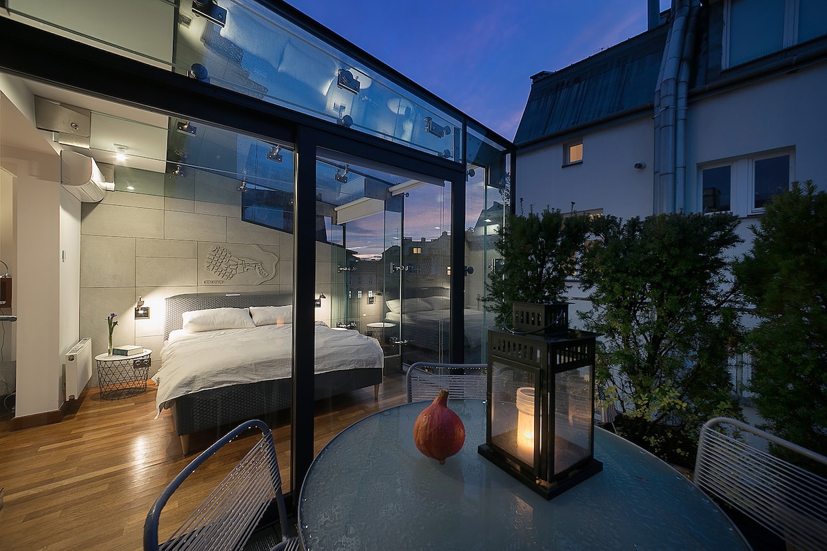 Selami Kota Tua Cracow dari apartemen penthouse dua lantai ini. Hidupkan kembali di interior yang cerah dan ber - AC dan kelas atas. Nikmati kopi yang baru dibumikan dan kagumi panorama kota dengan bangunan bersejarah dari salah satu dari dua teras atap pribadi. Tempat ini benar - benar unik seperti pemandangan yang disediakannya. HARAP PERHATIKAN: Di apartemen kami, dilarang keras mengadakan pesta/acara khusus apa pun.