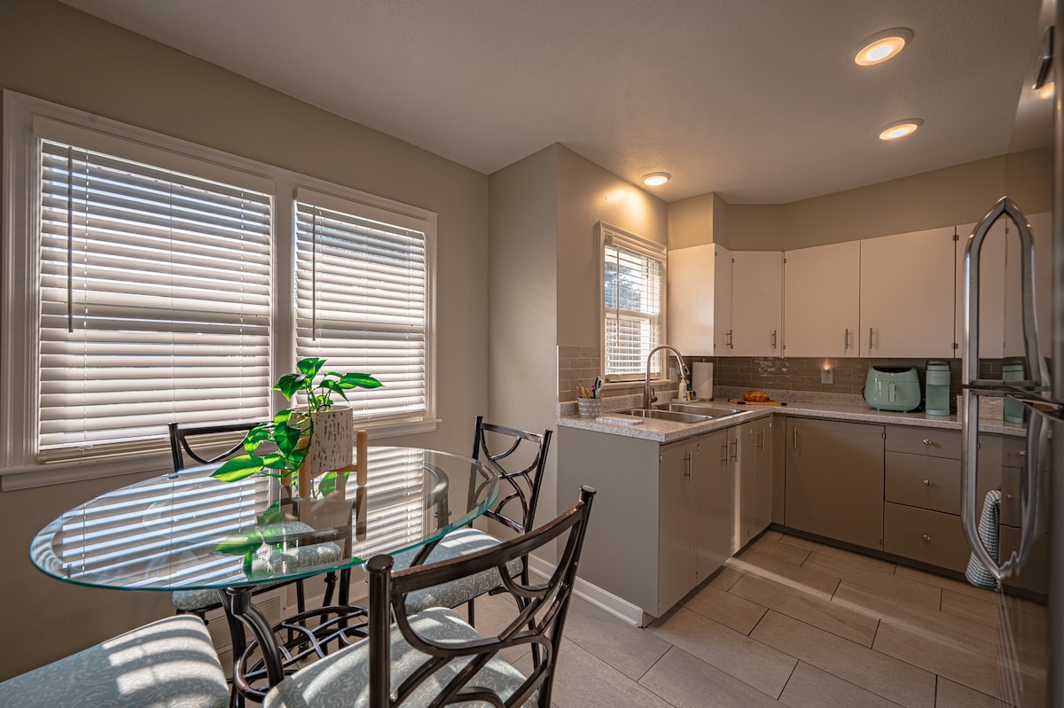 Bersenang - senanglah bersama seluruh keluarga di tempat bergaya ini. Cocok untuk 1-5 tamu! Sangat cocok untuk kru kerja - dua meja besar (10' & 8') berfungsi dengan baik sebagai bangku atau bengkel. Keluarga menyukai kolam renang baru di seberang jalan. Kami menyebutnya Park Place karena kami memiliki tiga rumah di blok ini - dan yang satu ini berada tepat di seberang taman!