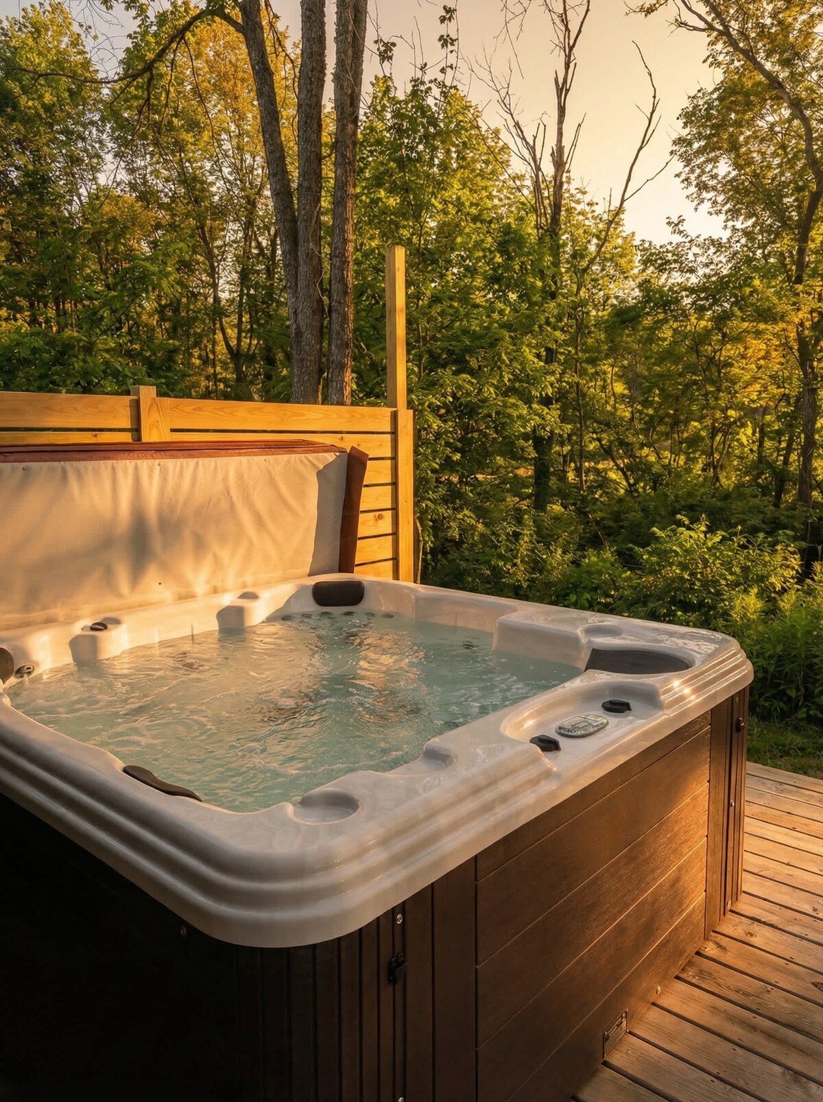 Rumah kecil yang nyaman dengan bak mandi air panas dan perapian di dekat sungai