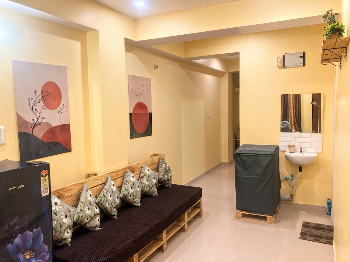 Hello! We're offering a stay in an entirely furnished, newly constructed & aesthetic 2 bhk apartment. We assure you a great stay here. โ Free covered parking is available within the premises. โ Easily accessible public transport as the apartment has access to the main road. โ Ola, uber and Rapido remain readily available here. โ Swiggy instamart, Jio mart and blinkit are available for delivering groceries. โ Swiggy & zomato are there for delivering food.