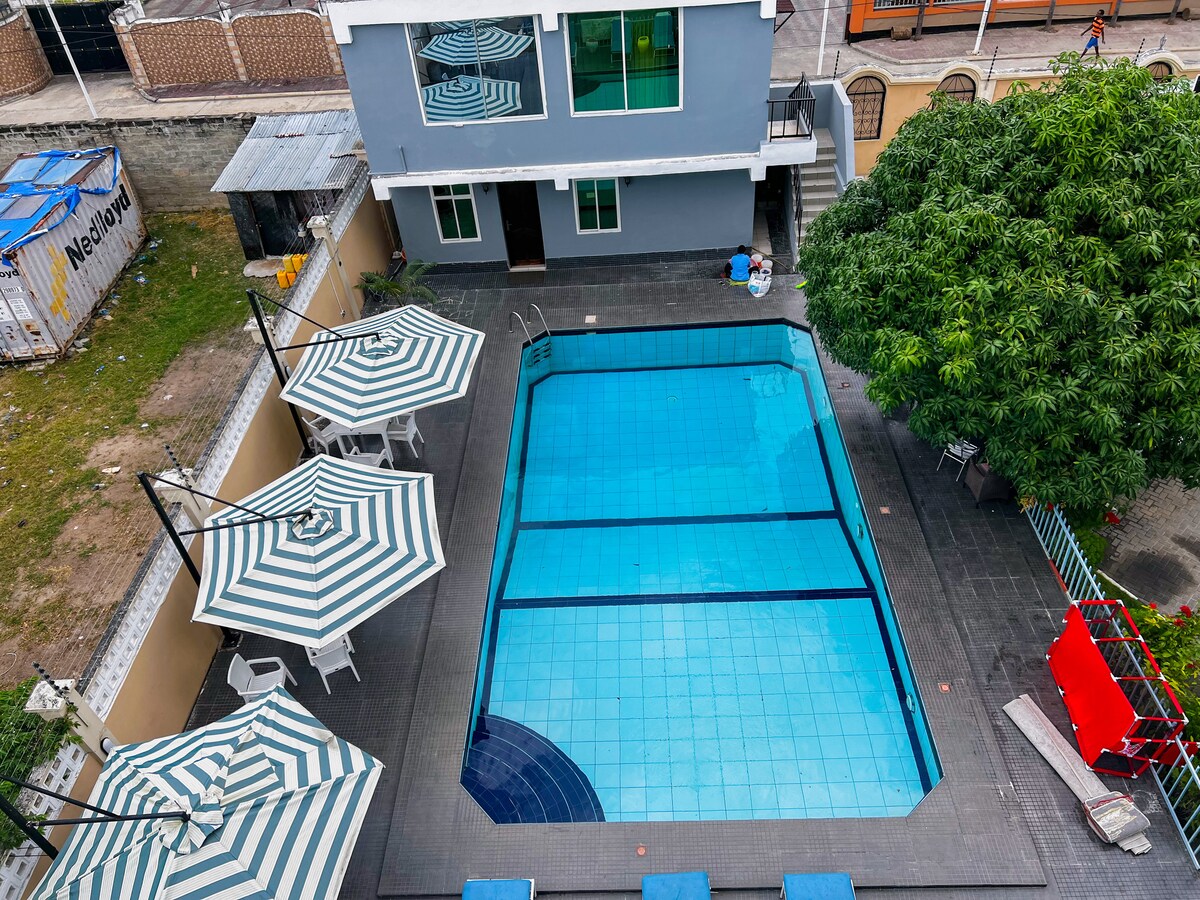 Rumah jati terletak unik dalam jarak 1 km dari Hotel Pantai kelas atas Samudra Hindia. Lingkungan yang tenang dengan Angin Laut yang Menenangkan yang membuat seseorang melupakan panas Dar es salaam. Parkir mobil gratis. Kolam renang ukuran penuh bersama menunggu Anda untuk terjun dan berenang. Rumah jati memiliki 3 kamar tidur berperabot bergaya, dapur yang bagus, dan ruang tamu yang luas dan luar biasa untuk kenyamanan Anda. WiFi gratis berkecepatan tinggi untuk kebutuhan komunikasi Anda. Kompleks ini dipagari dengan petugas keamanan penuh waktu.