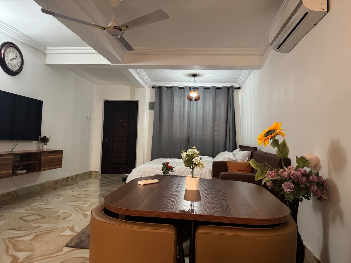 Ruang: Apartemen studio bebas asap yang hangat, dilengkapi dengan kamar mandi yang bersih. Dilengkapi dengan Wi-Fi berkecepatan tinggi gratis, AC, Smart TV 55 inci, dan dapur lengkap dengan mesin cuci. Unit ini memiliki balkon dengan furnitur luar ruangan untuk relaksasi Anda. Lokasi: Apartemen studio nyaman di seberang pusat perbelanjaan Accra. Hanya 10 menit berkendara dari bandara internasional. Properti ini sangat nyaman untuk berbelanja, restoran, klub, pub/lounge, pantai Labadi dan tempat-tempat menarik.