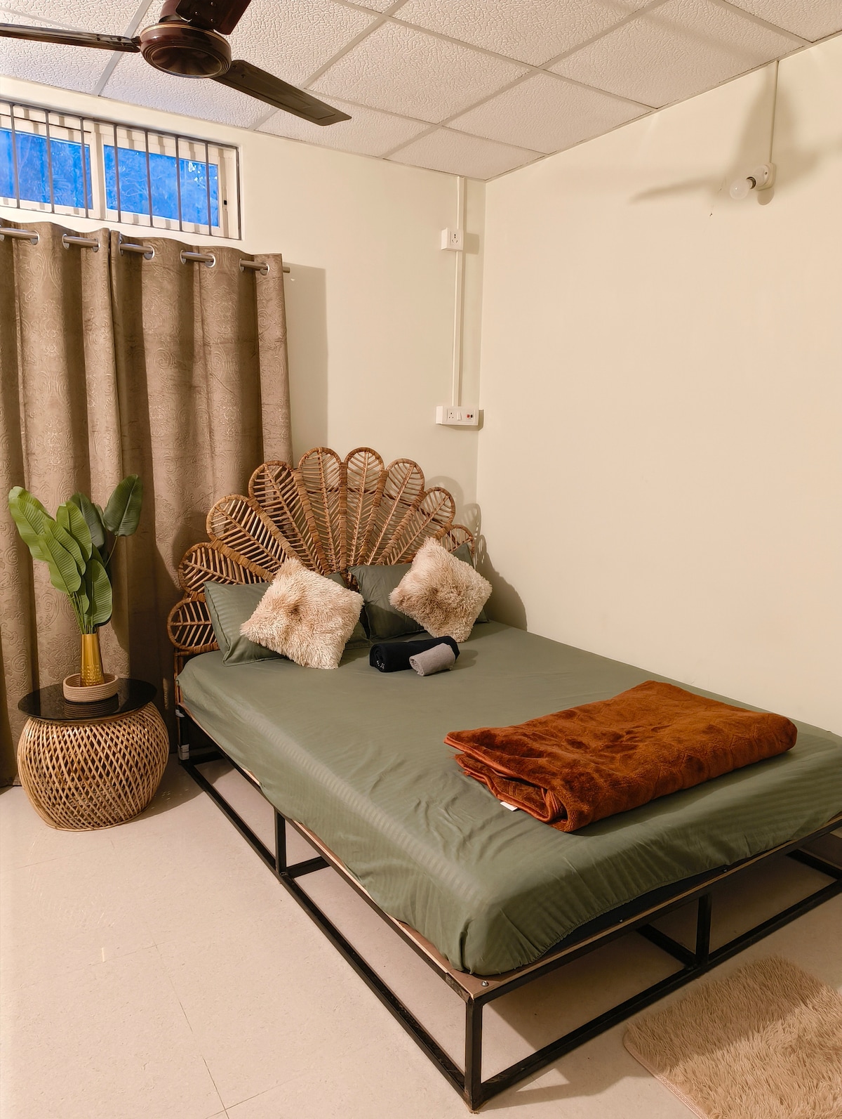 It’s a cozy and thoughtfully designed space with a charming sloped roof and minimalist interiors. Furnished with a comfortable bed, a compact kitchenette with a breakfast bar, and a private bathroom, it's designed for a relaxed, homely stay. The patio offers a sitting area, BBQ facilities, and space to stretch, unwind, or enjoy a quiet yoga session. It also frames lovely views of Gandhi Mandap, a nearby hillock that adds a sense of peace and quiet charm to the setting.