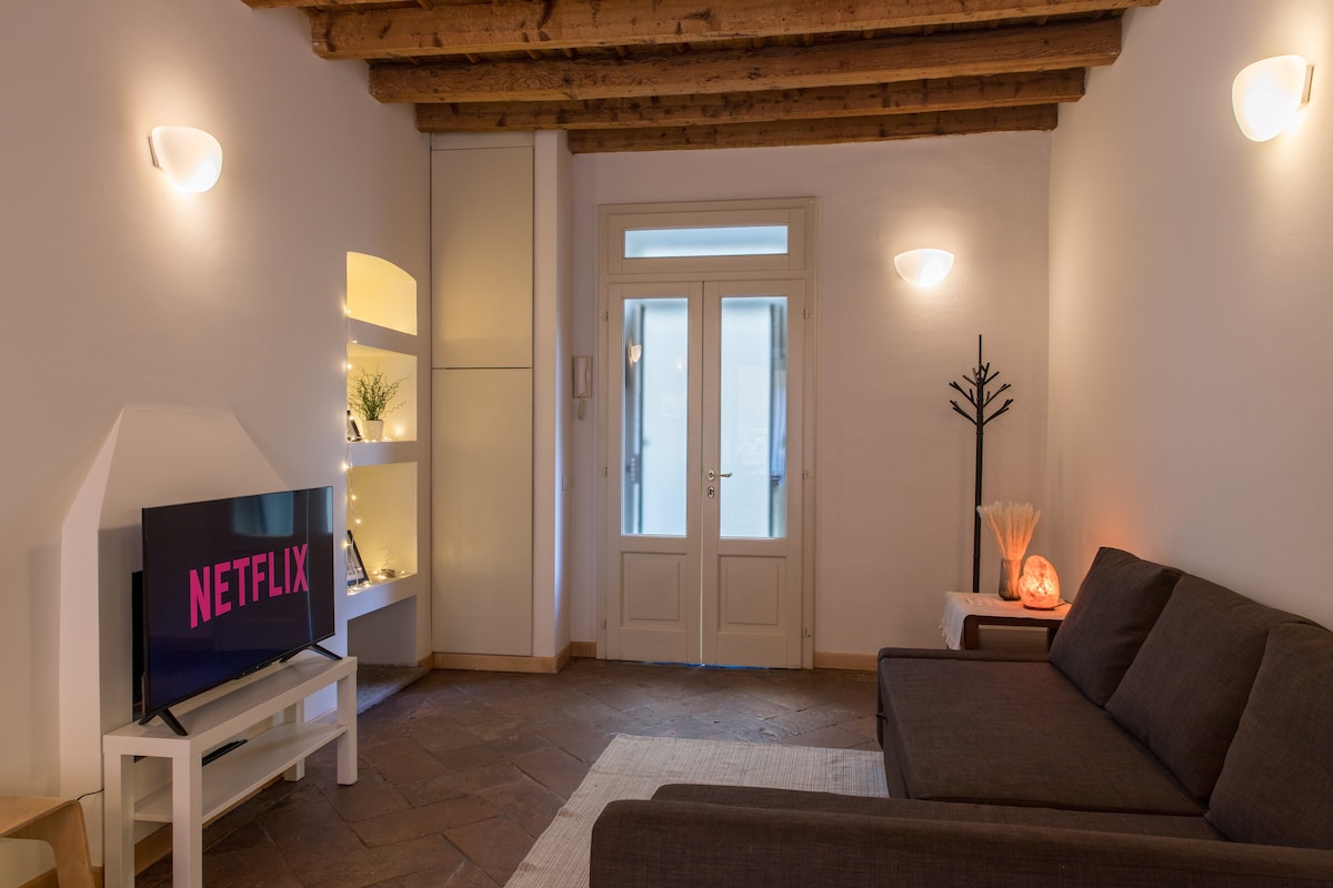 SANIFIED FLAT Historic Centre, in the apartment live the experience of a hotel suite in the heart of the Naviglio, in the quiet of a wonderful residential complex surrounded by a splendid garden 7700m²: 2nd floor 50m² overlooking the roofs: living room with sofa bed French wedding, divided by sliding glass walls into the sleeping area with French double bed, walk-in wardrobe, large bathroom with shower.