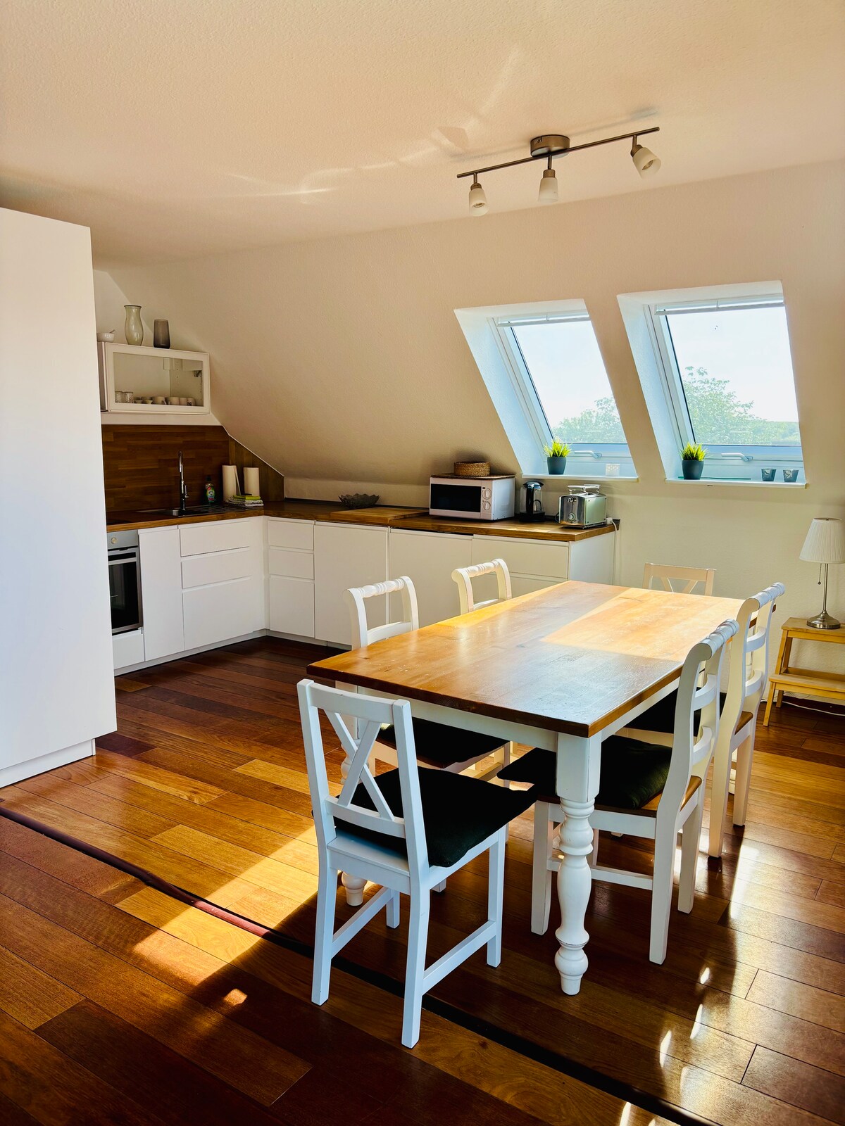 Sebuah penthouse, dua teras atap, empat balkon, pemandangan ke segala arah, di atas lanskap pesisir Mecklenburg ke laut, tepat di Teluk Lübeck, beberapa langkah ke pantai alami Laut Baltik dan belum jauh resor tepi laut yang meriah di Travemünde dan Timmendorfer Strand. Hanya merasa nyaman. Dengan perapian dan sauna. Mesin espresso dan kulkas anggur. Semua dalam desain loteng yang santai. Oasis ketenangan, suguhan untuk indera. Anda tidak akan pernah melupakan matahari terbit.