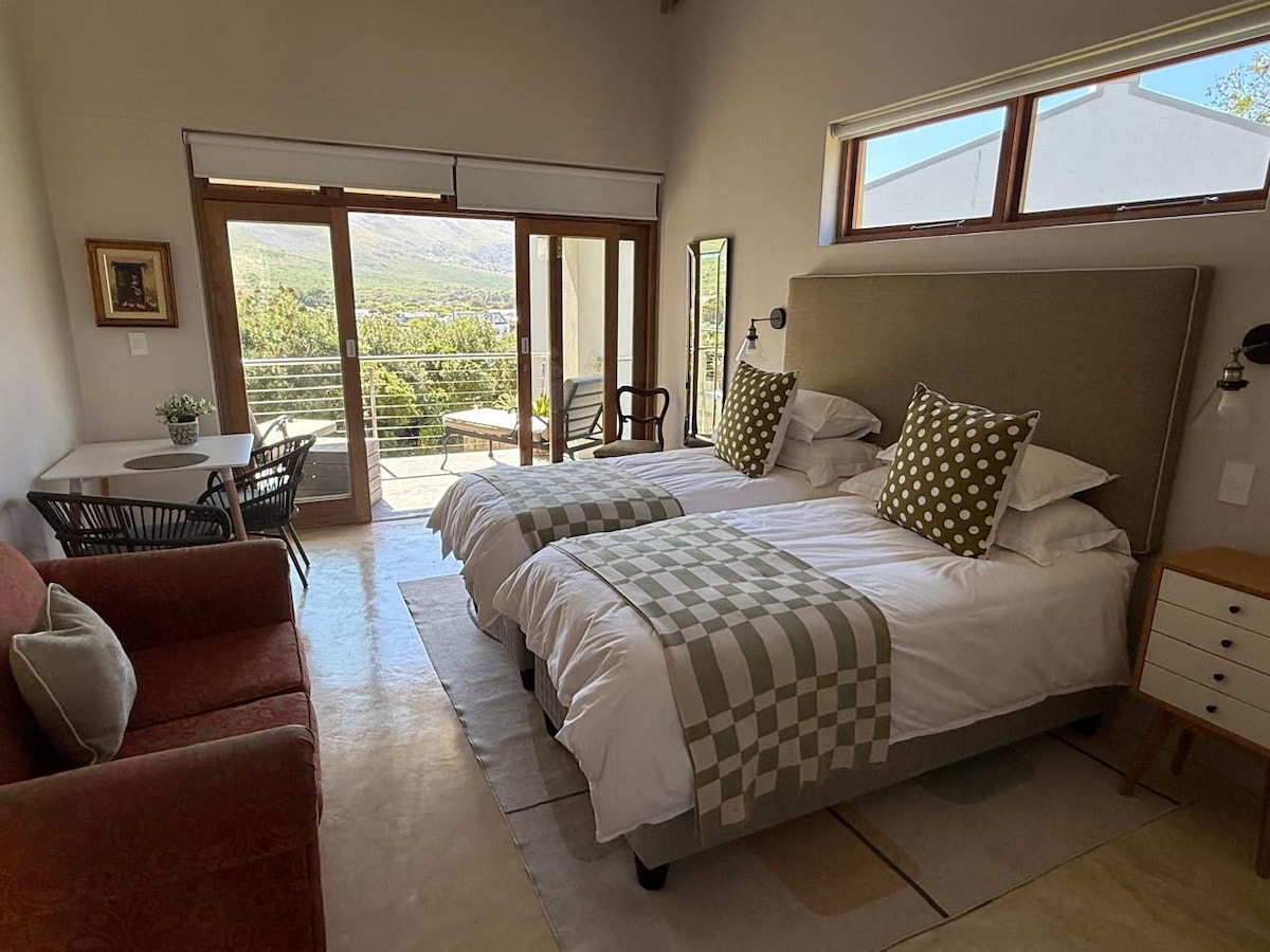 Bersantai di The Studio Room, tempat peristirahatan pribadi di Hermanus dengan pintu masuk dan tangga tersendiri. Bersantai di dek yang cerah dengan kursi santai, BBQ, dan pemandangan pegunungan. Ruang terbuka ini memadukan area tidur, makan, dan dapur kecil yang nyaman, sementara kamar mandi (mandi & pancuran) bersifat pribadi dengan pintu. Nikmati kenyamanan modern seperti AC, Wi-Fi, DSTV, dan Nespresso. Sempurna untuk pasangan yang mencari kedamaian dan privasi. Tidak ada anak - anak di bawah 12 tahun. Dapur kecil memiliki: Pemanggang roti, ketel, oven mini dengan pemanggang, & kulkas.