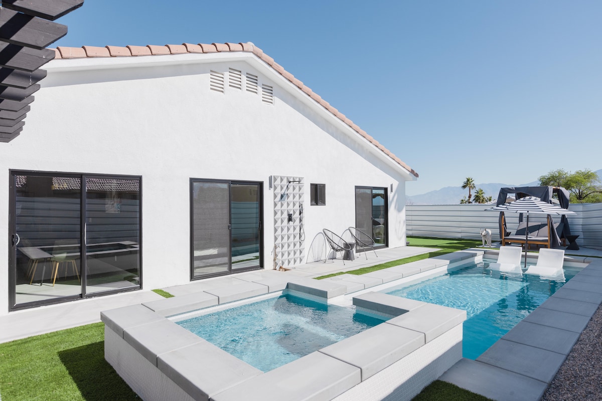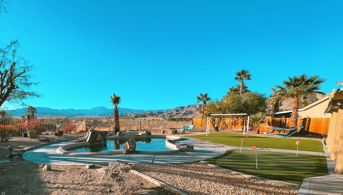 Nikmati liburan gurun yang cocok untuk keluarga di oasis modern. Berjemur di bawah sinar matahari di tepi kolam air asin pribadi, berendam di bak mandi air panas dengan pemandangan pegunungan yang menakjubkan, atau tantang teman-teman Anda untuk bermain mini-golf. Bersantai menonton matahari terbenam yang indah di sekitar lubang api. Bersantai di ruang tamu yang luas dengan sudut membaca yang nyaman, sangat cocok untuk bersantai dengan buku & menikmati film. Liburan impian Anda ke Coachella Valley menanti Anda! Snowbirds Kanada - Kirim pesan untuk mendapatkan diskon ramah 🇨🇦