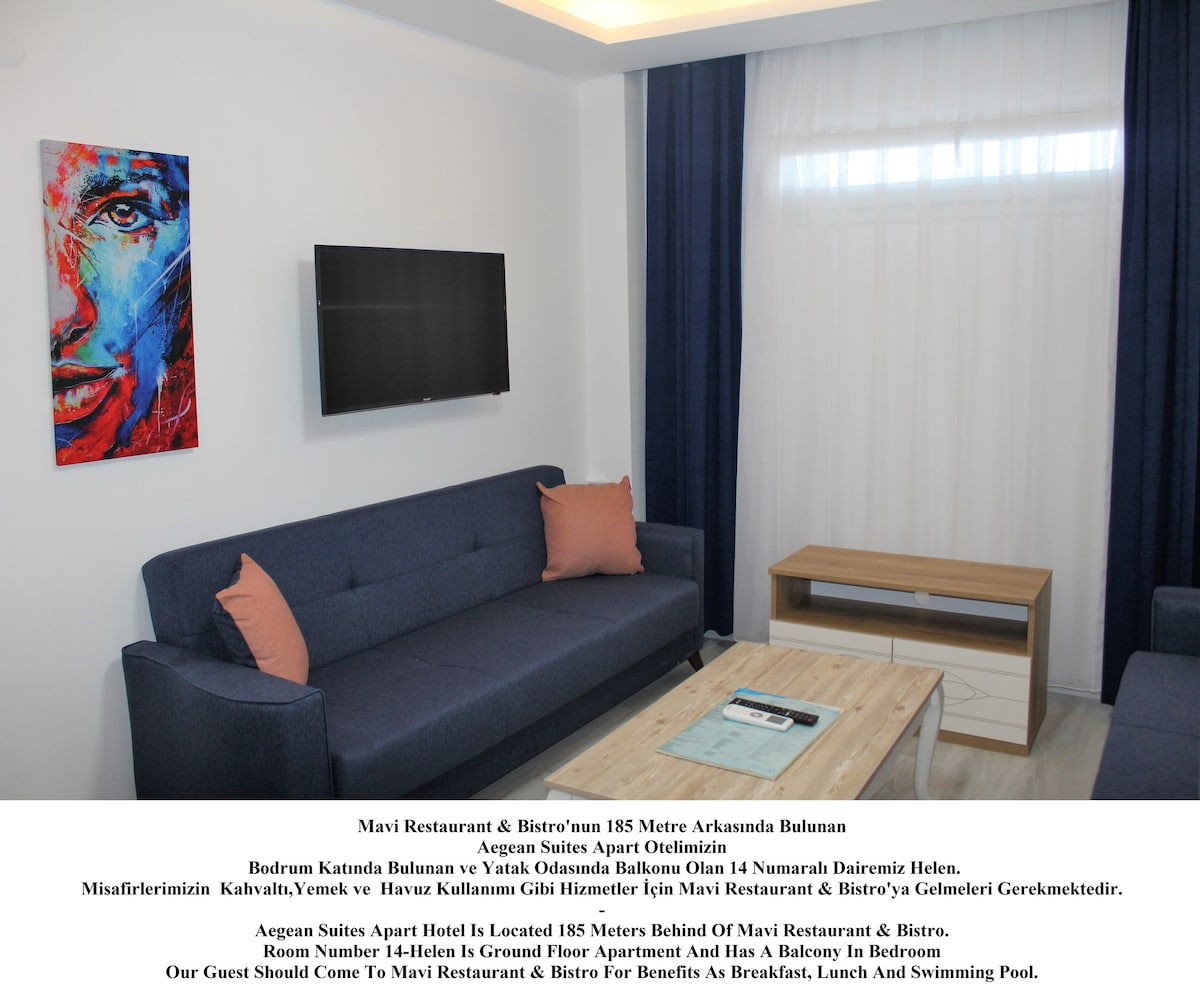 Terletak 185 Meter di Belakang Blue Restaurant & Bistro Helen adalah apartemen kami nomor 14, terletak di Buried Basement Aegean Suites Apart Hotel kami dan memiliki balkon di Kamar Tidur. Aegean Suites Apart Hotel Terletak 185 Meter Di Belakang Restoran & Bistro Mavi. Kamar Nomor 14 - Helen Terletak di Basement Floor Apartemen dan Memiliki Balkon Kecil di Kamar Tidur.