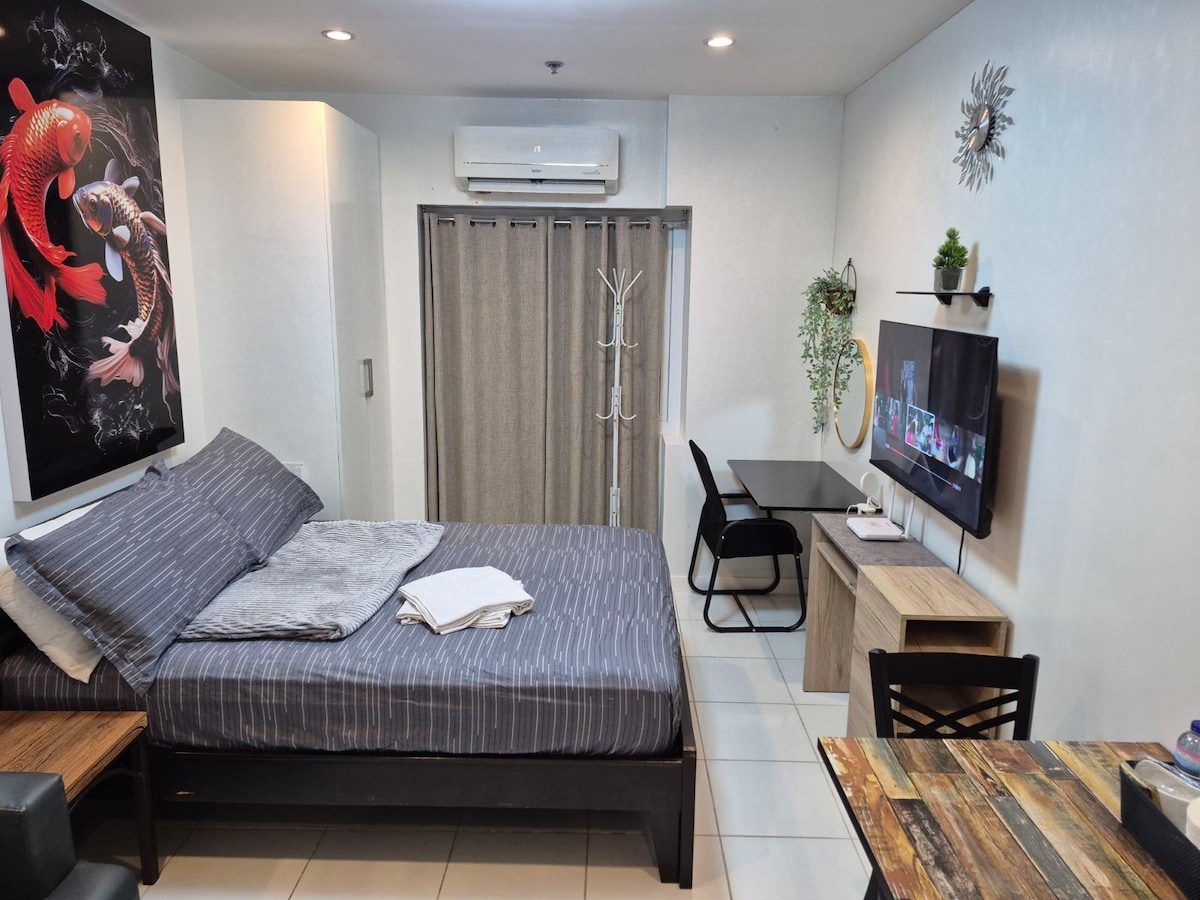 Selamat datang di unit studio yang nyaman di Quezon City ini, tempat peristirahatan sempurna Anda! Tempat ini memiliki tempat tidur double - size yang nyaman, smart TV 55 inci dengan Netflix, Disney+, dan HBO Go, yang dipasangkan dengan sofa kursi malas, dapur kecil yang ringkas namun lengkap, dan ruang tamu bergaya yang sempurna untuk bersantai setelah seharian menjelajah. Dengan kafe, restoran, dan tempat wisata yang hanya berjarak beberapa langkah, baik Anda berada di sini untuk bisnis atau liburan, studio ini menjanjikan masa inap yang menyenangkan di pusat kota.