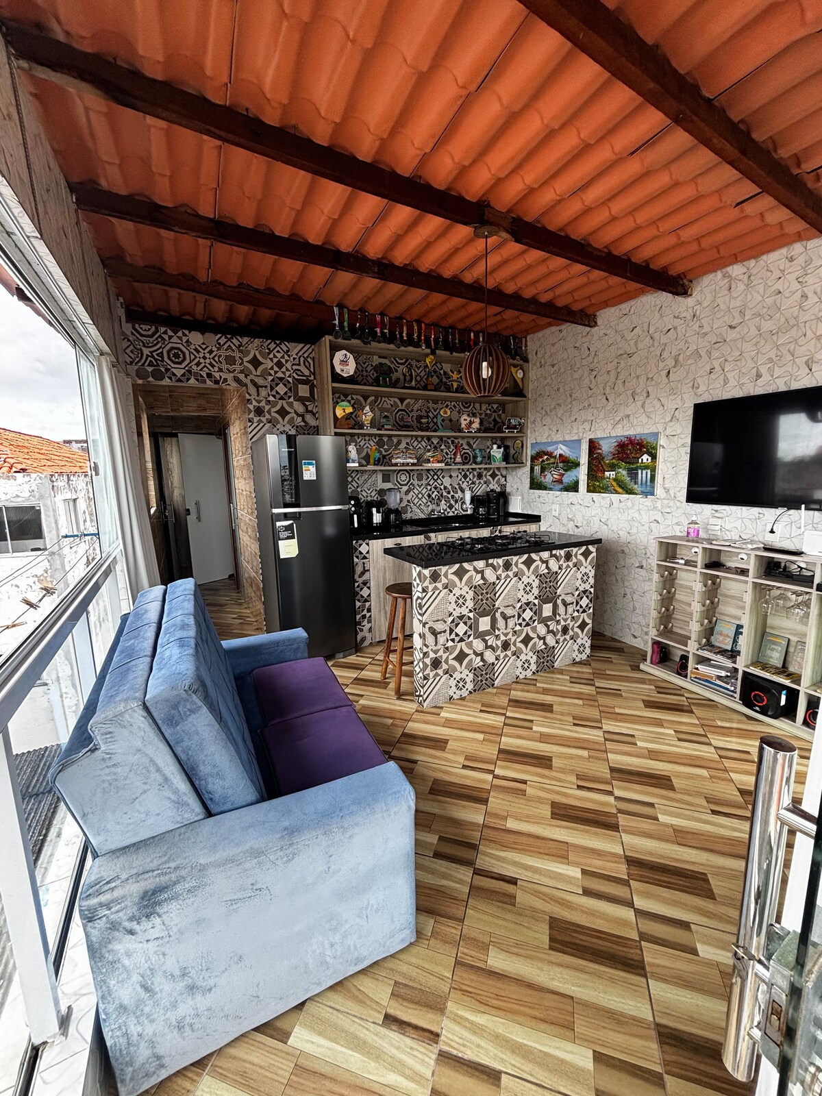 The boutique experience Discover this colorful, artistic getaway overlooking the Bay of Todos os Santos. Enjoy exclusive access to the third floor featuring a cozy bedroom, stylish living room and a small open-air kitchenette. Relax on the roof top with a tub and open-air shower while enjoying breathtaking sunsets. You’ll be sharing the rest of the house with my family, 2 friendly dogs & 2 cats. We offer a delightful breakfast in the main kitchen.