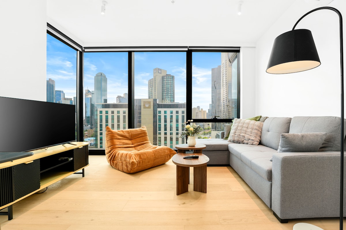 Enjoy a clean, relaxed experience at this centrally located place. Try the top floor! In Melbourne CBD this place really stands out. Phenomenal sunsets! Unencumbered views to the bay, rivers, Docklands, WestGate & Bolte Bridges, distant hills, city lights. Convenient. Walk to Crown, ConventionC, Marvel Stadium, Southern Cross Station, il Mercato Centrale. Great amenities: Pool/spa/sauna/gym. 1x Quality queen bed + Quality 2x sofa beds, linen, Hot shower, Kitchen, Ergonomic Desk, AppleTV