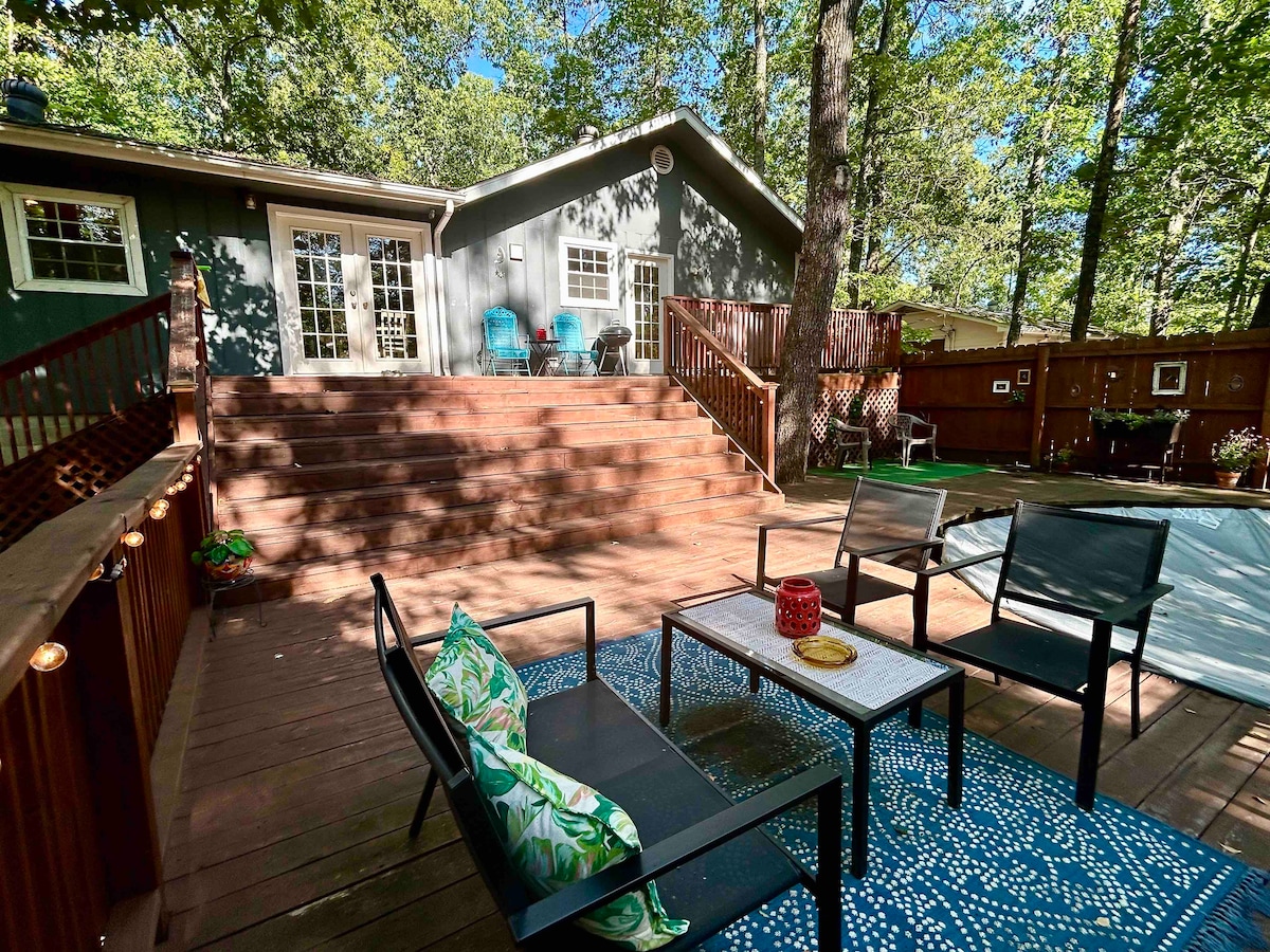 Surrounded by nature, this home has a huge back patio and pool deck/ grilling area that faces the forest and sunset, great for entertaining. A four minute drive from the Bull Shoals White River State Park, guests have easy access to fishing and boating in the beautiful river. Local restaurant Gastons is just down the road, as well as multiple nearby small towns for all your shopping and dining needs. End the day relaxing in the master bathtub or in the recliners by the fireplace.