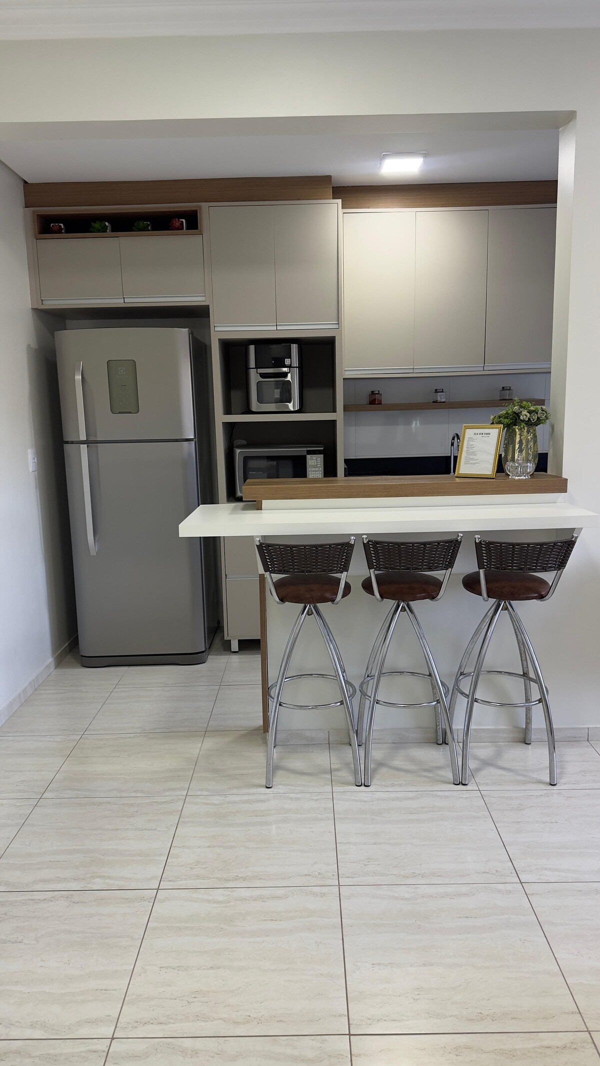 Apartemen 104, nyaman dan lokasinya bagus, dekat dengan pusat kota. Tempat ini memiliki kamar tidur besar dengan tempat tidur berukuran king, kasur ekstra, AC, dan TV pintar 50". Kamar mandi dengan pancuran ganda, ruang tamu dengan TV, Netflix, dan sofa nyaman. Dapur dilengkapi dengan microwave, penggorengan udara, dan peralatan makan. Tempat ini juga memiliki ruang cuci dengan mesin cuci dan pengering, balkon dengan kursi dan pemandangan alam yang menakjubkan, ideal untuk momen yang damai. Handuk dan perlengkapan tempat tidur ekstra disertakan.