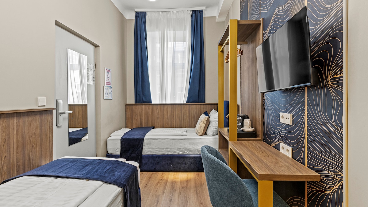 Selamat datang di hotel Anda yang nyaman dan eksklusif di kota Wina! Kami sudah menantikan kedatangan Anda di kota terkenal di Danube. Semua kamar dilengkapi dengan lantai parket ramah alergi, kamar mandi atau pancuran, WC, cermin rias, tisu wajah, gel untuk membersihkan tangan, gel mandi, pengering rambut, kendi air listrik, monitor layar datar TV kabel UPC, telepon. Kamar triple - sekitar. 25 m2