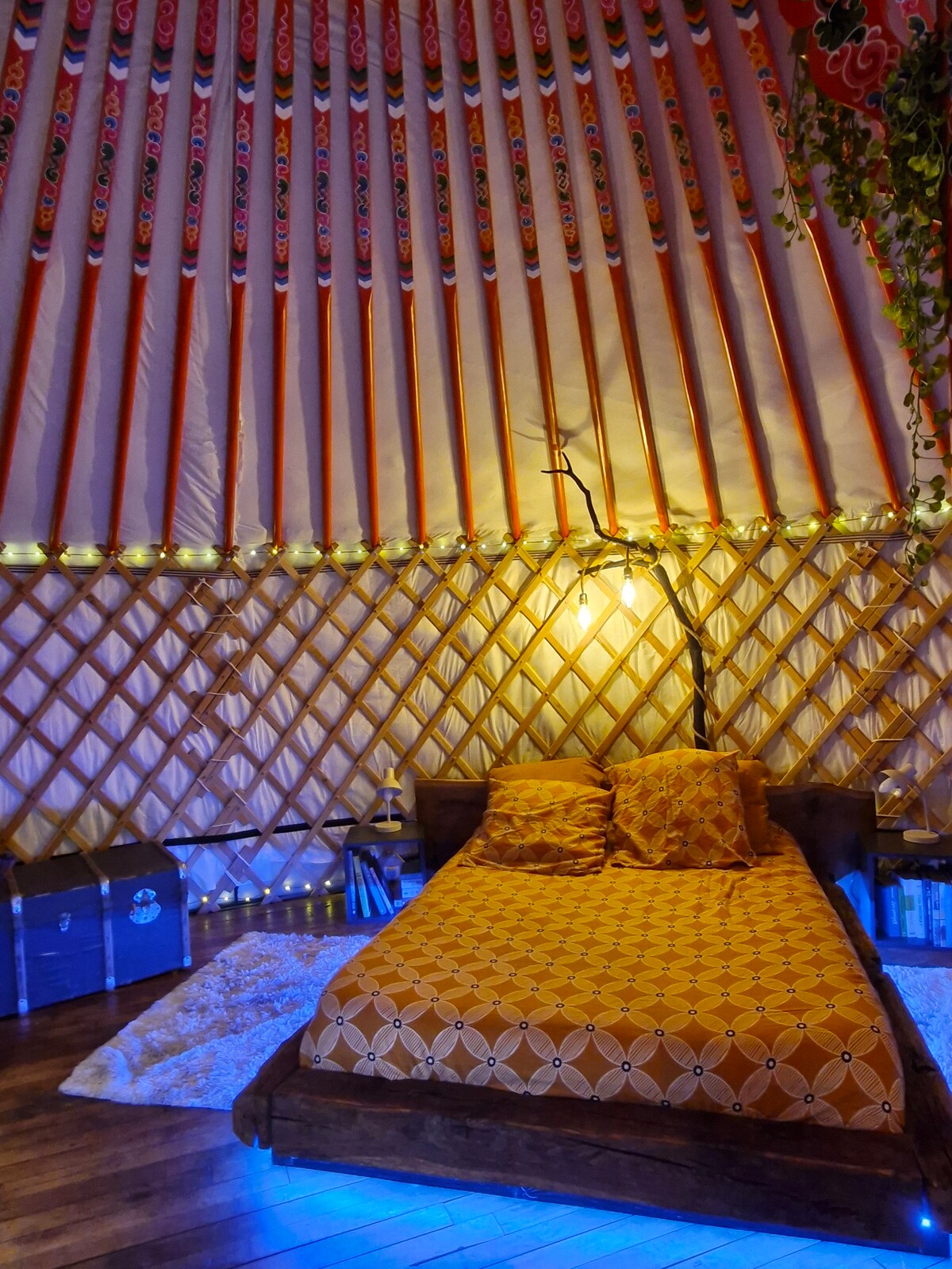 Nikmati suasana luar biasa yurt kami yang terletak di hutan, di terasnya yang menghadap ke salah satu kolam. Yurt ini bisa menampung hingga 4 orang, dengan tempat tidur double berukuran 160x200 dan sofa bed berukuran 150x190. Yurt dilengkapi dapur dengan kulkas, kompor gas (termasuk piring + peralatan masak), serta kamar mandi (pancuran + toilet kering). Kompor kayu bakar. Untuk melengkapi masa inap: mandi Nordik! Pilihan makanan yang mungkin: lihat menu di foto.