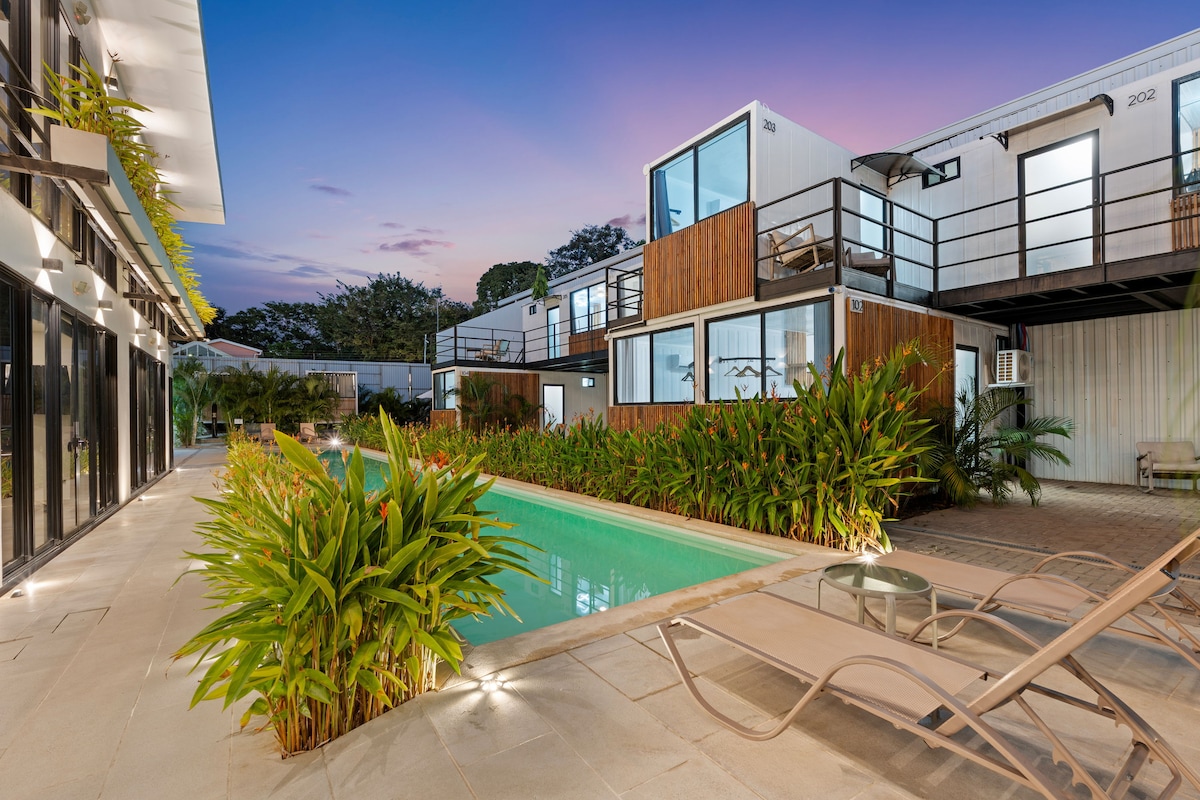 Nikmati studio bergaya Skandinavia unik khusus dewasa kami, yang dibuat dari kontainer pengiriman modern. Sempurna untuk 2 orang, tempat peristirahatan yang tenang ini memiliki tempat tidur king, dapur kecil, dan Wi-Fi berkecepatan tinggi. Bersantai di tepi kolam renang lap bersama di oasis tropis kami, hanya berjarak 2 menit berjalan kaki dari pusat kota yang semarak. Liburan yang bergaya dan damai menanti.