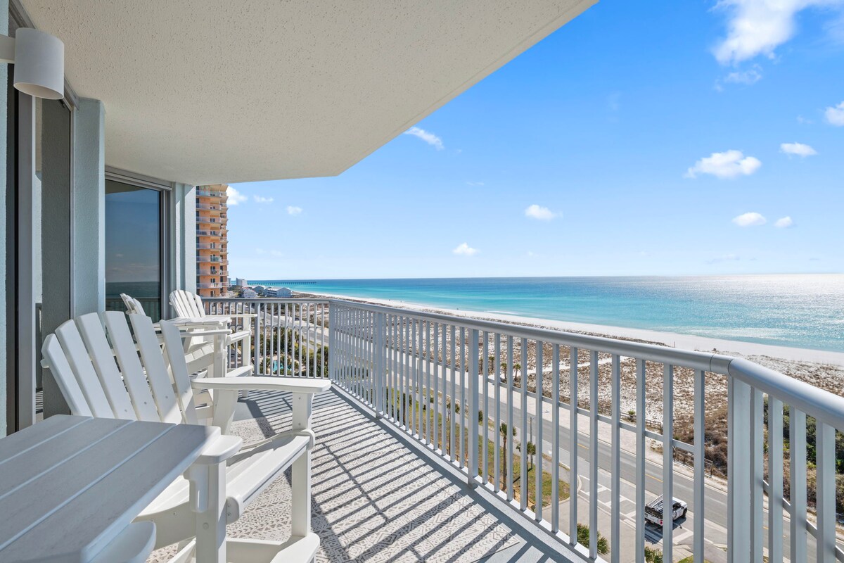 Welcome to Pensacola Perch, an 8th‑floor beachfront condo offering expansive views of Pensacola Beach—perfect for dolphin watching and catching the Blue Angels airshow. This modern 2BR/2BA condo sits in the highly sought‑after Emerald Isle gated resort, where guests enjoy premium amenities including direct beach access, two swimming pools, a hot tub, sauna, and a beachfront fitness center. From March–October, enjoy complimentary beach chairs and an umbrella from La Dolce Vita.