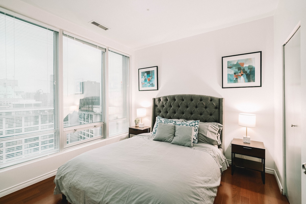 - Wi-Fi cepat 715+ mbps - Queen sangat nyaman, 100% tempat tidur busa memori - Smart TV 75" - AC - Skor Berjalan Kaki: 100% - Skor Transit: 100% - Pasar Swalayan di seberang jalan - Seprai/handuk katun 100% Bangunan ini mencakup: - Pusat kebugaran - Sauna - Meja biliar - Ruang kerja bersama (Wi-Fi gratis) - Area duduk di luar ruangan - Penatu gratis Berjalan kaki ke Stadion BC Place (⚽🏟️), 2 jalur kereta, pantai, konferensi, restoran, pusat perbelanjaan, jalur sepeda/sepeda bersama. "Tidak ada hotel yang bisa dibandingkan." Tidak ada tugas rumah tangga saat check-out.