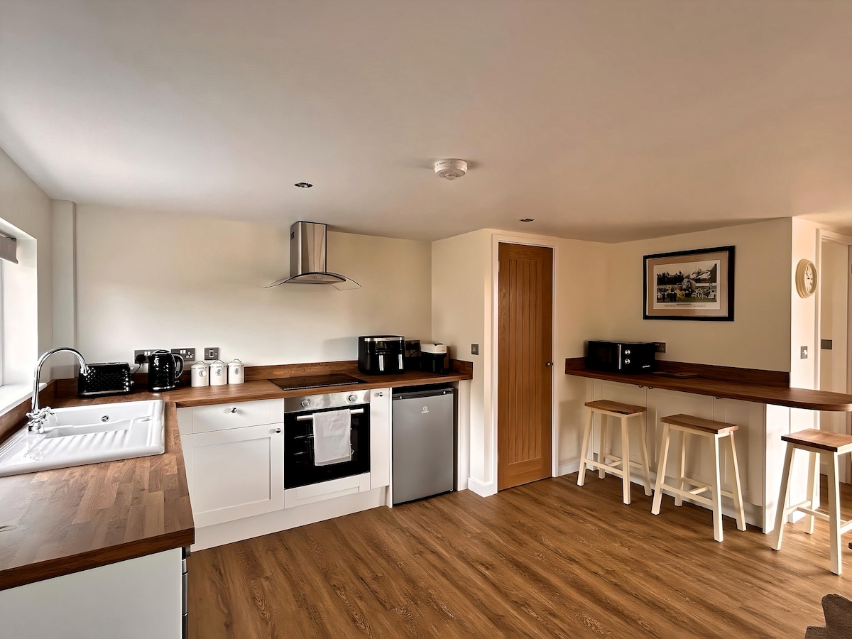 Lumbung yang indah diubah menjadi flat stabil berkualitas tinggi dengan balok dan fitur asli, tidur 1 atau 2 orang - sayangnya tidak ada anak - anak atau hewan peliharaan. Aula masuk pribadi, cocok untuk menyimpan mantel dan sepatu bot setelah seharian menjelajahi pedesaan kami yang menakjubkan. Lantai atas ringan dan lapang dengan langit - langit tinggi dan banyak jendela. Pemandangan menakjubkan dari flat menghadap kandang kuda. Tempat tidur berukuran king yang nyaman, dengan kamar mandi en - suite. Dapur/area makan yang berfungsi penuh dengan ruang tamu terbuka.