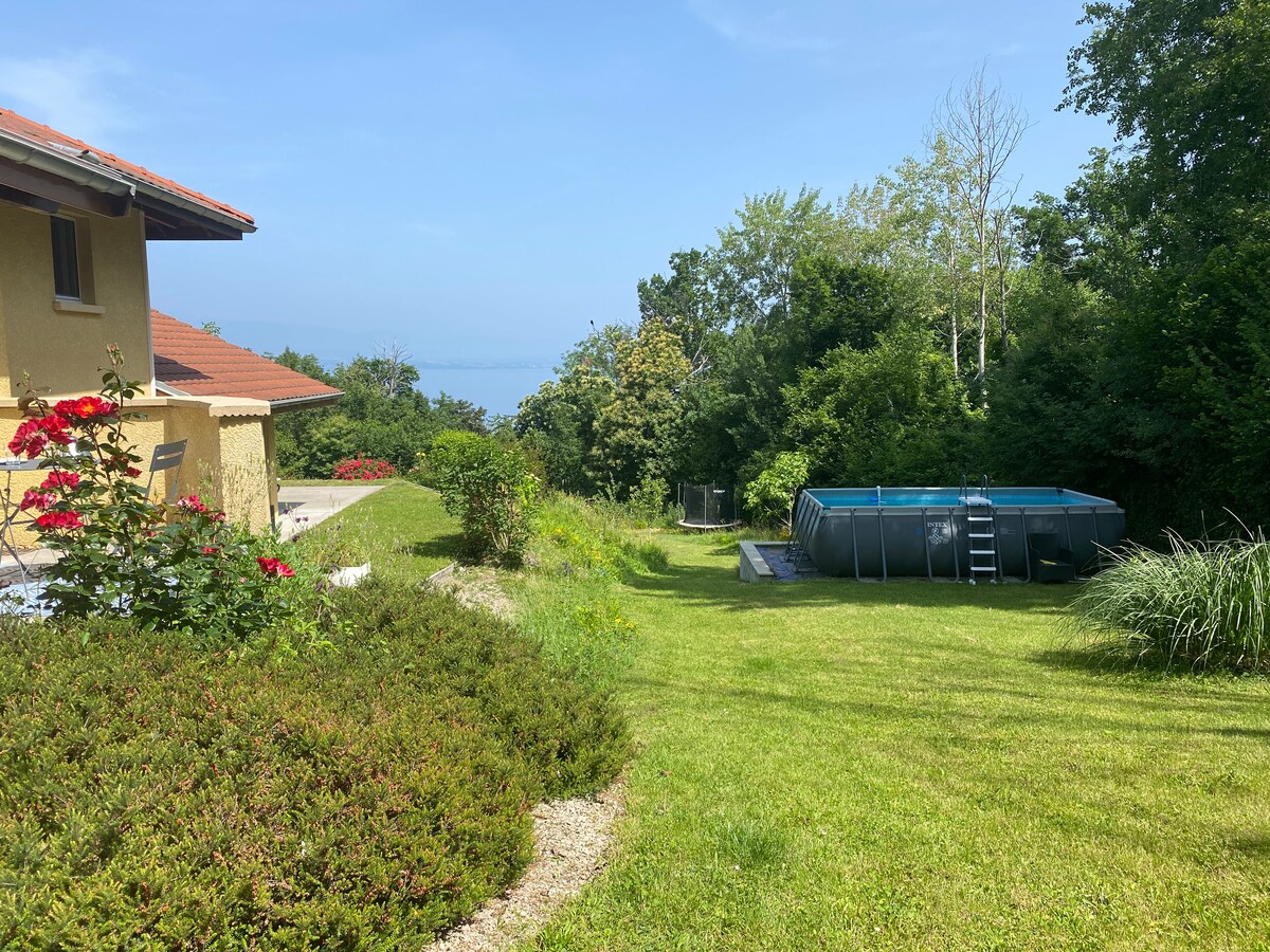 Apartemen di lantai dasar rumah dengan pemandangan danau. Ideal untuk keluarga, hanya 20 menit dari resor keluarga kecil Thollon les Mémises dan Bernex, 50 menit dari stasiun besar Avoriaz dan Châtel. Anda mencari ketenangan, lingkungan pedesaan 5 menit dari Evian dan Thonon , jadi tempat kami cocok untuk Anda! Nikmati ruang tamu dan teras yang indah dan cerah dengan pemandangan Danau Jenewa Dapur Terbuka - Kamar Mandi Pancuran Seprai dan handuk disediakan.