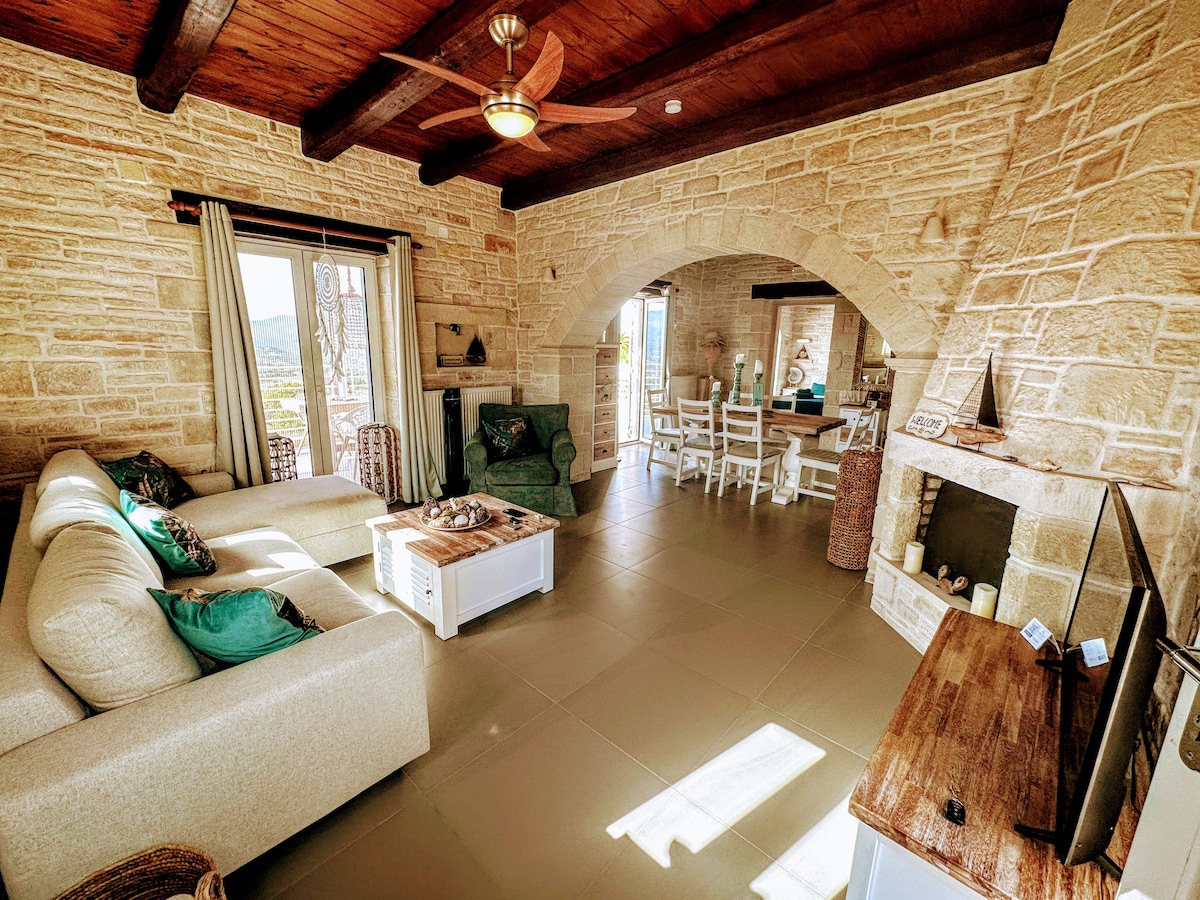 Cinnamon Hill Villa adalah tempat perlindungan pribadi, dengan taman lanskap yang indah, rumput alami yang mengelilingi kolam renang dengan pemandangan menakjubkan pegunungan putih, Laut Aegea, dan Teluk Souda. Rumah ini dirancang sebagai tempat perlindungan untuk pemulihan dan kesehatan. Tempat ini memiliki 3 tempat tidur siang permanen dan 4 tempat tidur gantung untuk bersantai! Angin Utara meniup angin sejuk yang indah melalui kebun. Kami berada di puncak bukit seluas 3000 meter persegi tanpa tetangga hanya pohon Zaitun di sebelah kanan dan kiri.