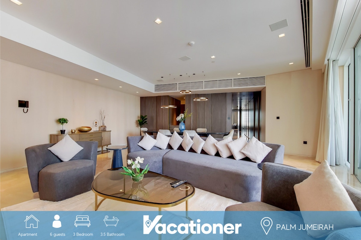 Located on the iconic Palm Jumeirah where exquisite apartment living meets resort lifestyle. guests are treated to the five star amenities such as the landscaped gardens, roof terraces, swimming pools, outdoor Jacuzzis, and a fully equipped Gym. If this wasn't enough, guests also have the luxury of the beach right on their doorstep! This three bedroom apartment offers an unforgettable stay that is only a short car ride away from many other exciting areas of Dubai to explore.