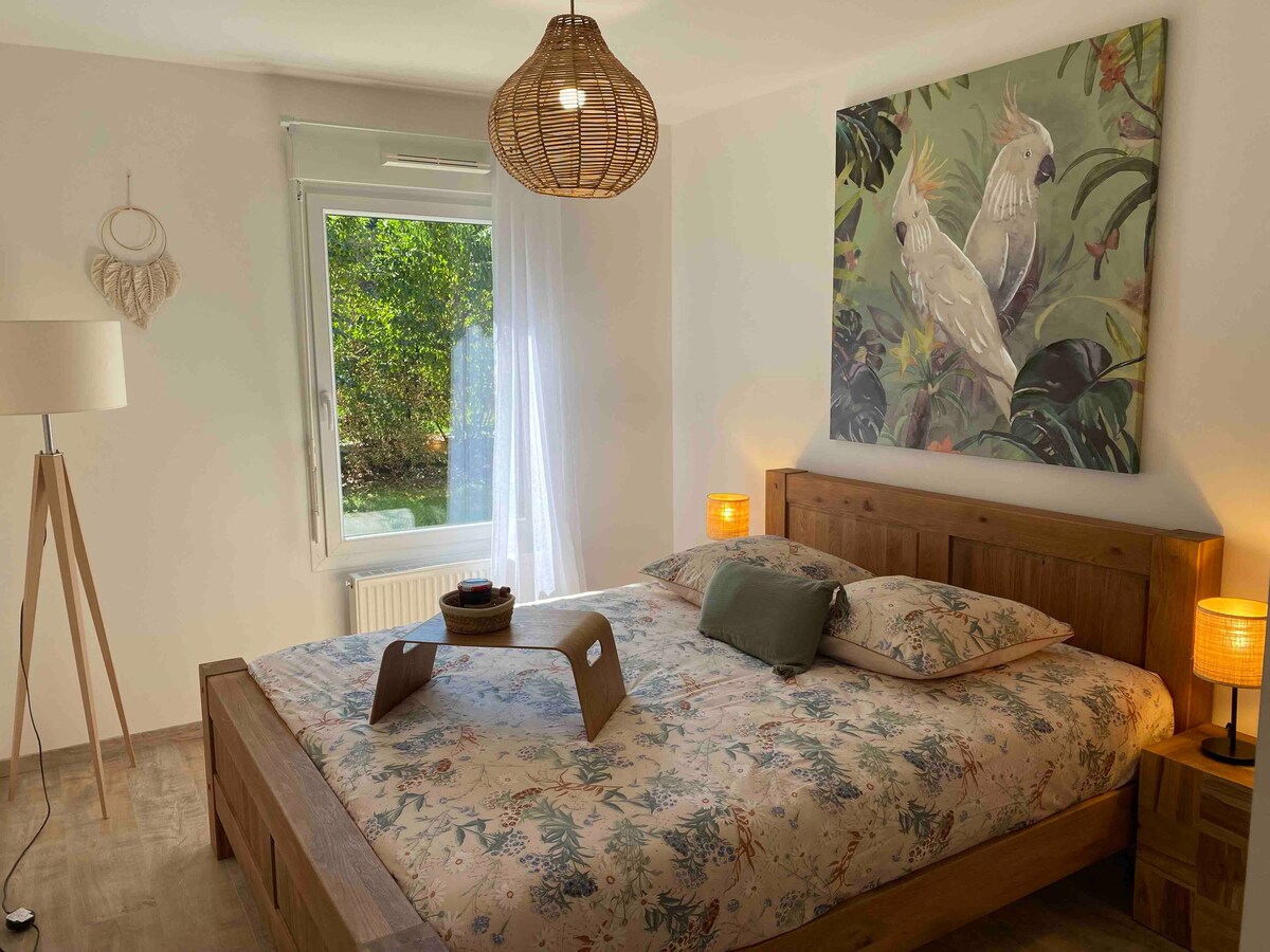 Bersantai di apartemen unik dan tenang ini, untuk dua orang, dengan pemandangan Danau Annecy dan pegunungan yang menakjubkan. 3 km dari pusat Saint - Jorioz, datang dan nikmati apartemen baru yang menawan dengan semua fasilitas dalam suasana unik. Anda akan berada di kaki jalur hiking dan juga bisa mendapatkan manfaat dari penyimpanan sepeda. Tempat tidur queen, seprai dan handuk disediakan dan termasuk kebersihan. Juga bahasa lisan: Jerman.