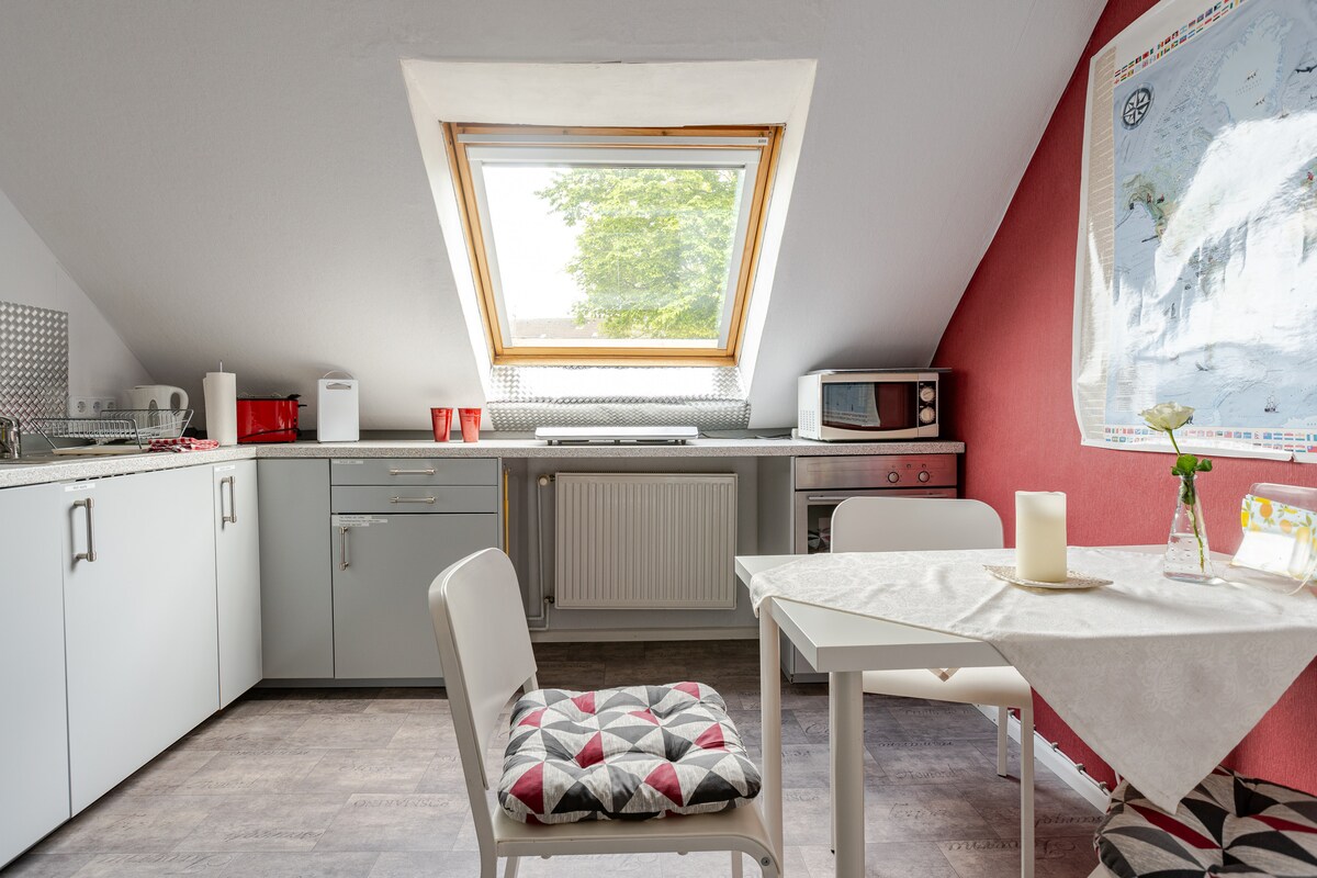 The attic apartment (52 m²) with a living room, a bedroom with double bed (1.80m), a kitchen with plenty of space and a bathroom with shower and toilet is accessible via a separate entrance. From the bedroom and living room you can be seen ships passing by on the river Rhine.