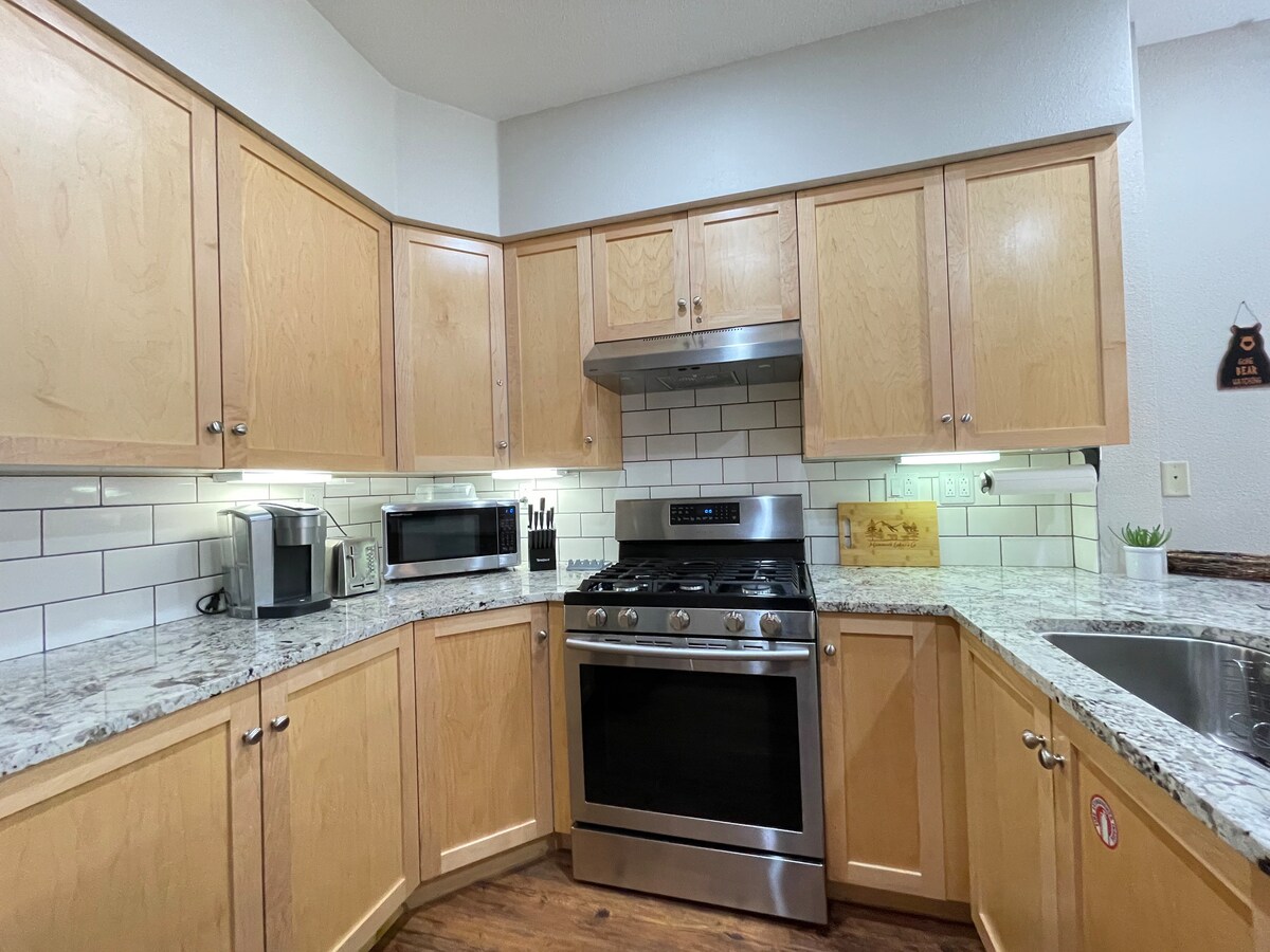An updated ski-in ski-out condo with phenomenal views of the High Sierras. This 2 bed 2 bath condo is located at Sunstone Lodge just steps from the Eagle Express Chair lift for easy access on and off the mountain. This condo can sleep up to six guests with a king bed in the master bedroom, two twin beds in the guest bedroom, and a pull-out memory foam mattress in the living room. Cozy up next to the fireplace after a day of skiing to watch a movie on the living room's 65 inch 4K Smart TV.