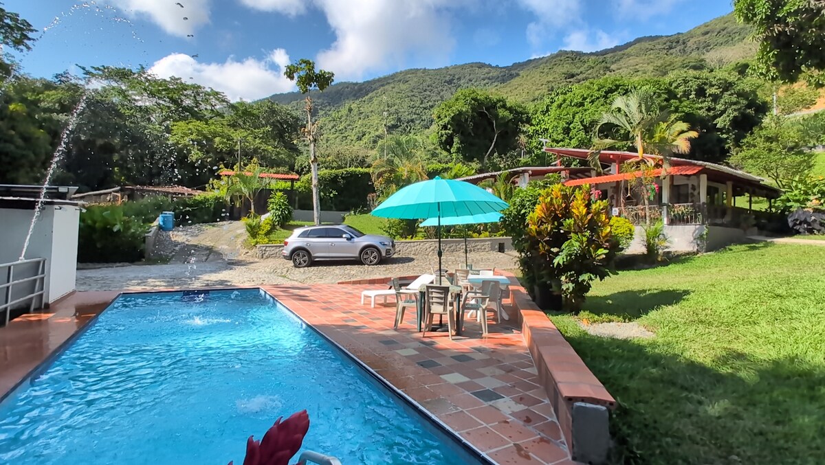 Bayangkan terbangun dengan nyanyian burung, minum kopi dengan angin segar dan menikmati pemandangan Sungai Cauca yang spektakuler. Di "La Margarita y El Tiberio ", waktu berhenti bagi Anda untuk menjalani momen tak terlupakan. Rumah tradisional dan nyaman dengan kolam renang pribadi, kios dengan tempat tidur gantung, BBQ, dan area hijau besar. Bersantai, terhubung dengan alam dan, jika Anda mau, tetap aktif dengan tim latihan kami. Wi - Fi tersedia dan hewan peliharaan dipersilakan. Semua pribadi untuk Anda.
