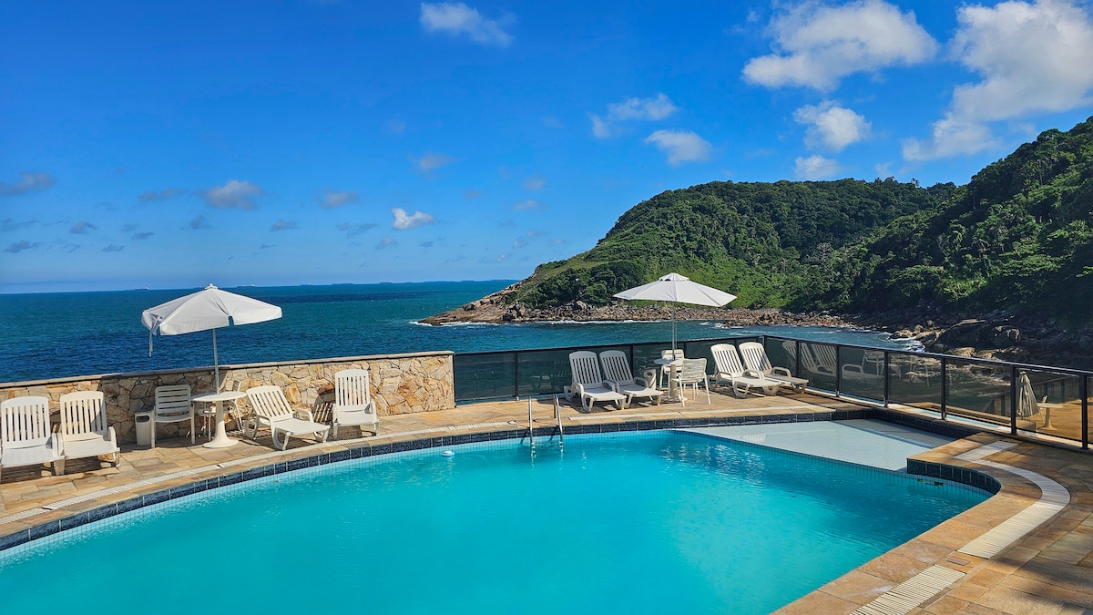 Apt Enseada Guaru dengan kolam renang, AC, dan tempat BBQ.