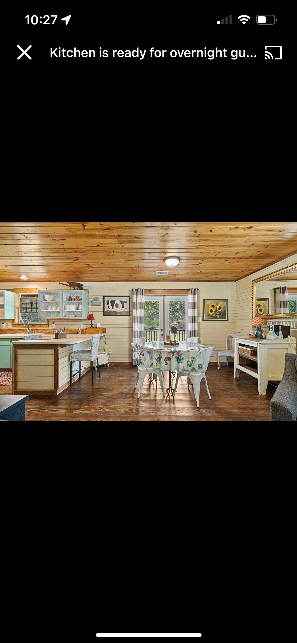 Mungkin saya agak parsial, tetapi saya benar - benar harus mencubit diri saya sendiri saat mengunjungi pondok Callie. Bayangkan...jalan pedesaan yang indah, tenang kecuali suara sapi sesekali. Sebuah pondok terselip di banyak pepohonan, mengelilingi teras, area perapian batu bendera, lampu teras digantung di halaman, mantel antik dengan api gas, lampu gantung kristal, papan manik - manik dari rumah pertanian tahun 1800 - an, bak mandi yang cukup besar untuk dua orang, tempat tidur yang paling indah, drama musik klasik, permen disajikan. Menghela nafas dalam.