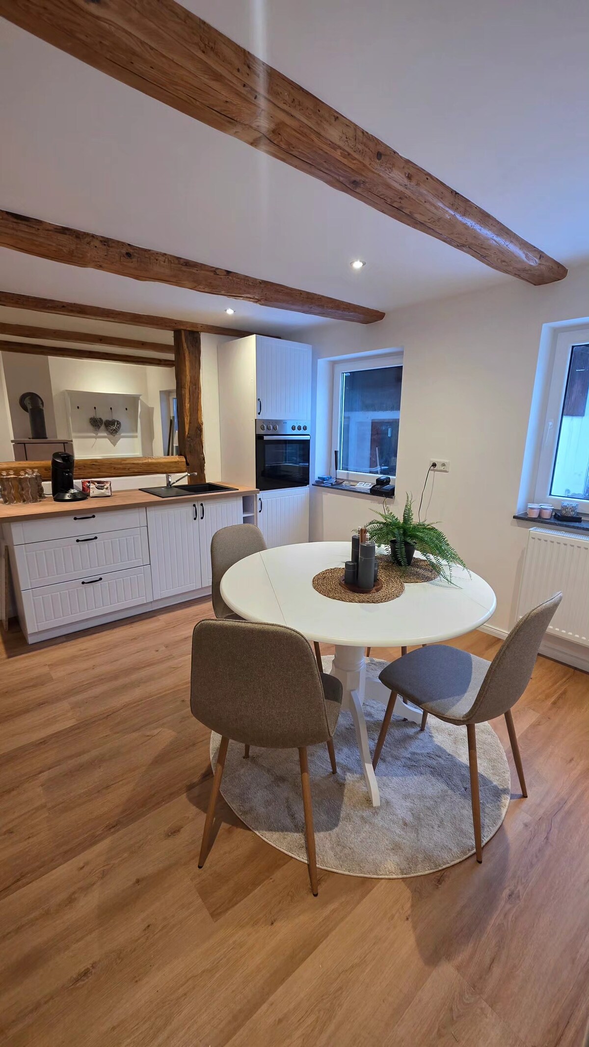 Di bawah balok terdapat apartemen yang telah direnovasi dengan balok kayu yang terlihat, gaya pedesaan yang cerah, dan suasana yang hangat. Sebuah oven memberikan kehangatan yang nyaman selain pemanas gas. Apartemen ini sepenuhnya baru dilengkapi perabot, ramah anjing, dan ideal bagi tamu yang menyukainya nyaman dan autentik. Area luar ruangan akan didesain ulang selama bulan musim panas. Lokasi tenang di Angerstein untuk beristirahat dan tiba!!!