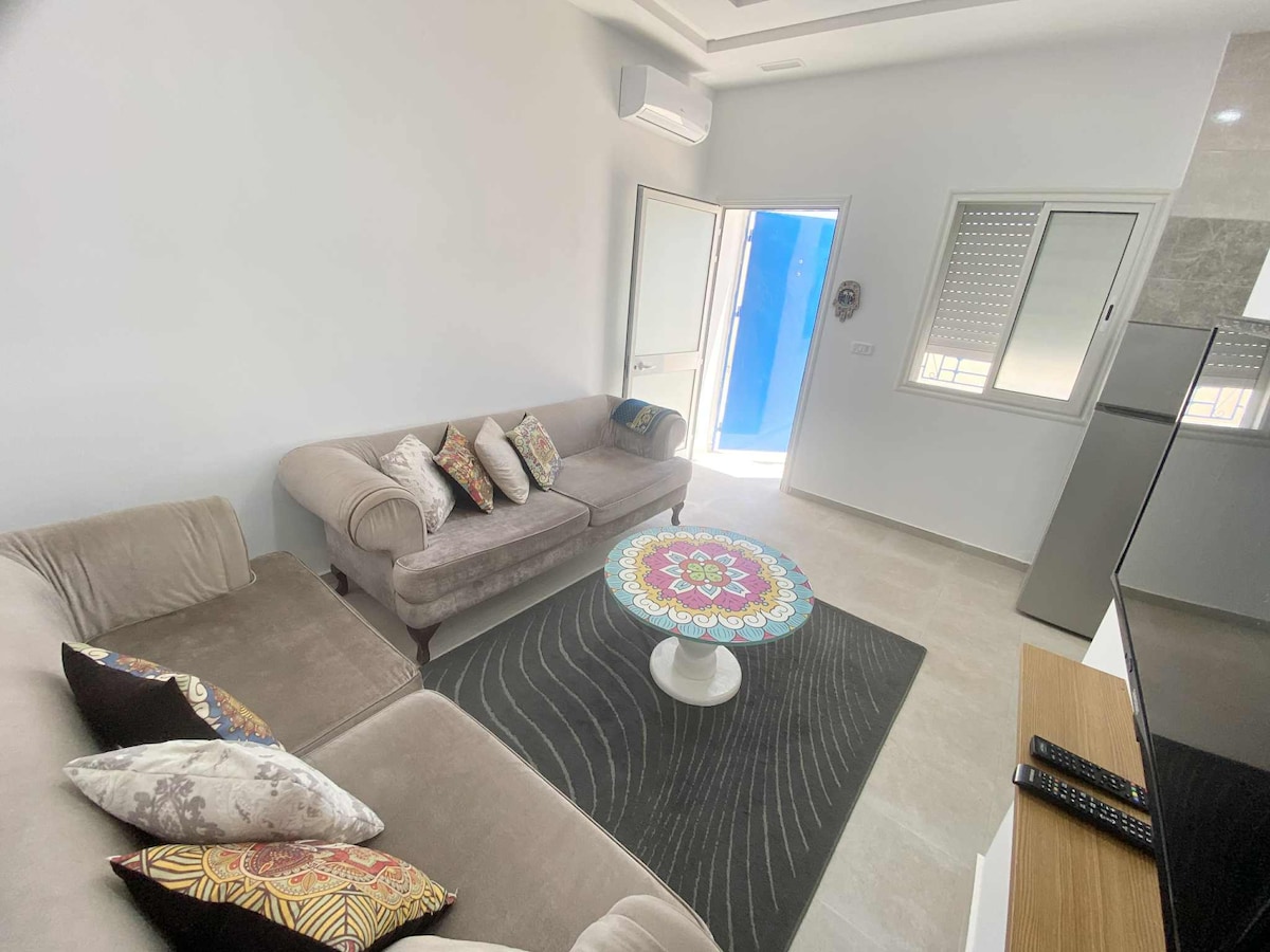 Nikmati liburan Anda di apartemen pantai yang bergaya dan berkualitas tinggi di lokasi laut langsung di pulau Kerkennah yang indah • Dua kamar tidur • Ruang tamu modern ber AC • Dapur lengkap • Teras besar dengan area makan dan area barbekyu Hanya beberapa langkah dari pantai, lokasinya sangat ideal untuk rekreasi, kenikmatan mandi dan malam yang tenang di tepi laut. Tuan rumah mereka ramah, membantu, dan bisa berbahasa Arab, Prancis, Inggris, dan Jerman