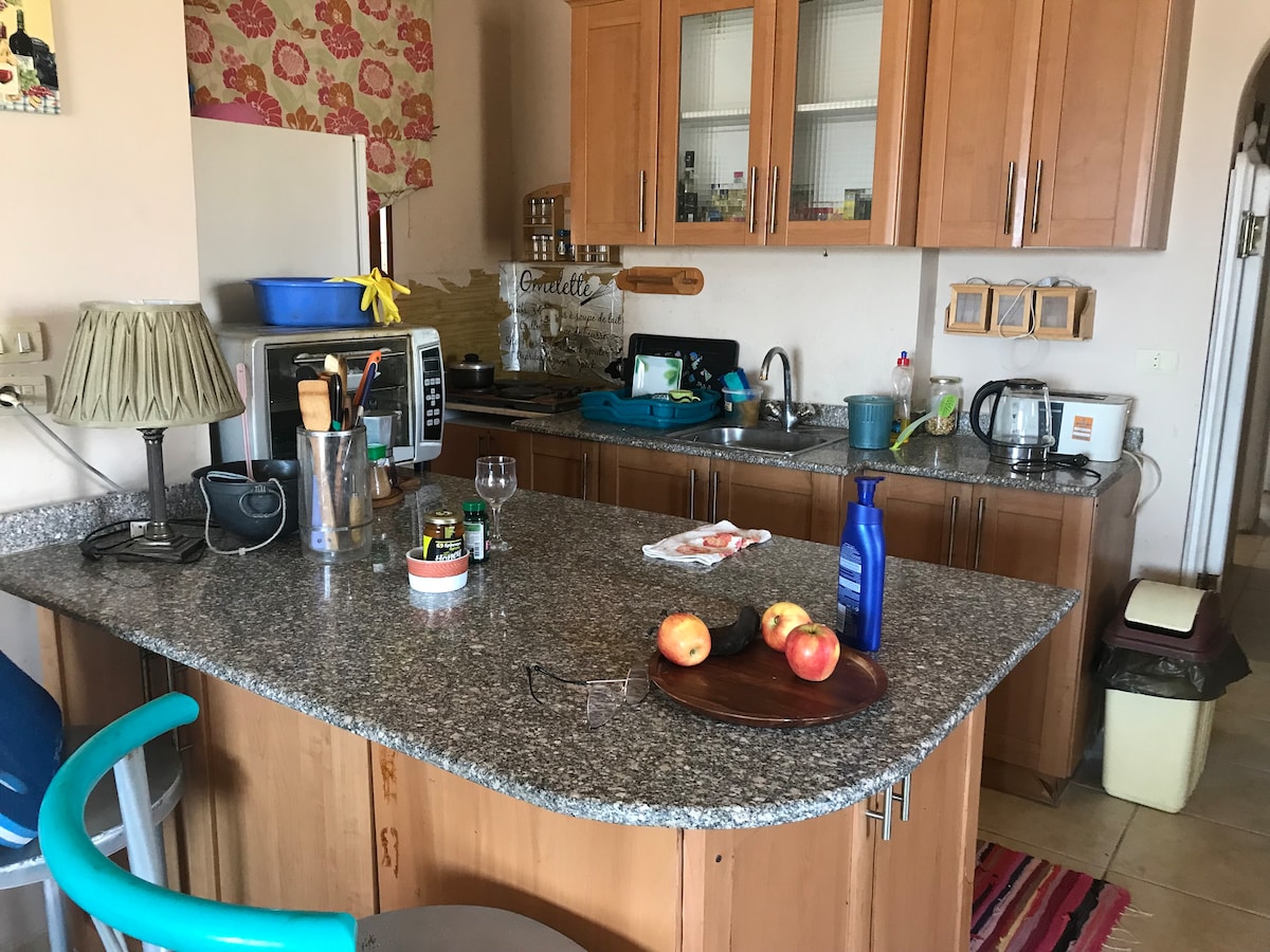 Flat pantai yang luas dengan 3 kamar tidur besar dan pemandangan laut yang luar biasa. Dapur lengkap dan kamar tidur ber - AC dan 2 kamar mandi. Pantai berjarak 5 menit berjalan kaki dan 1 menit berkendara. Anda dapat menikmati berendam di kolam renang atau makan di bar pantai sebelum bersantai di bawah payung Palm Beach yang unik dan pribadi. Jet ski dan perahu tersedia untuk disewa di pantai.