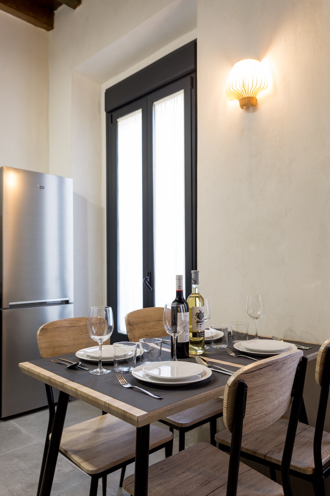 Beautifully restored townhouse converted into a modern vacation rental celebrates the old building structure with warm modern interiors and a touch of industrial style. Floor-to-ceiling, French windows look out over traditional balconies on to the charming street below. Sunlight floods the open plan space, casting light on exposed sandstone walls and illuminating the stunning oak beam ceilings. The shared top floor terrace offers incredible views to the Cathedral roof and the Giralda.