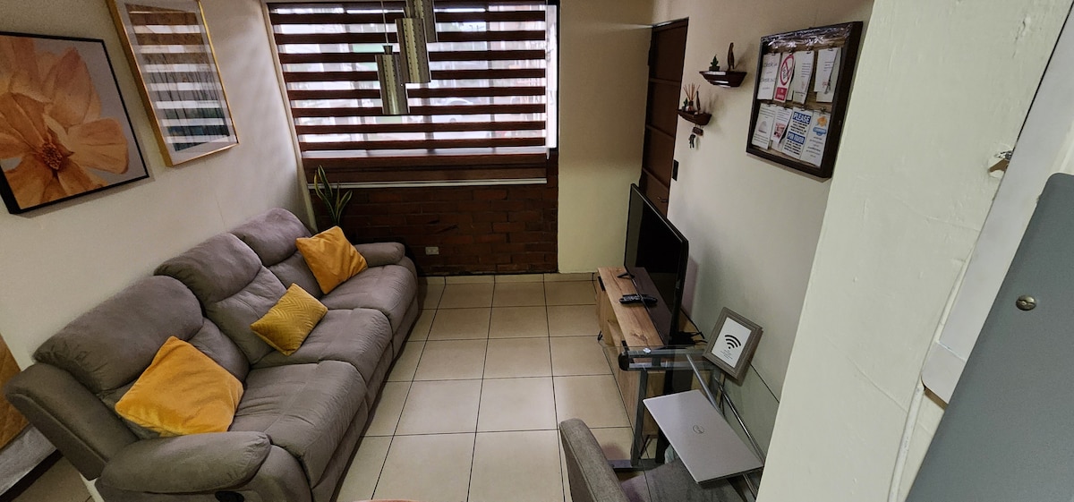 Apartemen Mini: 1 kamar tidur dan ruang tamu dengan AC, Smart - TV - Kabel, Wifi 80 mbps, dapur, area laundry bersama, di area perumahan yang aman. Terletak 45 menit dari bandara, 5 menit berjalan kaki ke Pusat Perbelanjaan Plaza San Luis, Rumah Sakit Militer, dan 15 menit dengan kendaraan ke Metrocentro. Di sekitarnya akses mudah ke restoran, supermarket, apotek, layanan bus, Universitas Nasional, dll. Nikmati pengalaman yang menyenangkan di akomodasi berlokasi strategis ini.