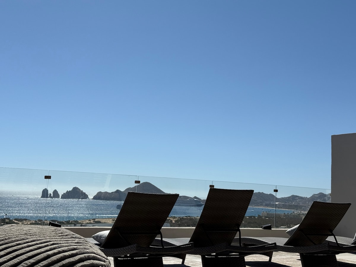 BRAND NEW TWO LEVEL LUXURY PENTHOUSE WITH JACUZZI -Massive private terrace with jacuzzi, grill, dinning table, lounge and firepit. -Best location -Next to Costco (3Min walk) -4Min walk to Plaza Novva offering stores and restaurants -2Min drive to Walmart -2Min drive to Hospital -5Min drive to Medano Beach -8Min drive to Downtown, Cabo L -Secured Gated Entrance -Parking Space -Beach chairs and umbrellas -3 Bedrooms -3 Bathrooms -5 TV -GYM -Pool