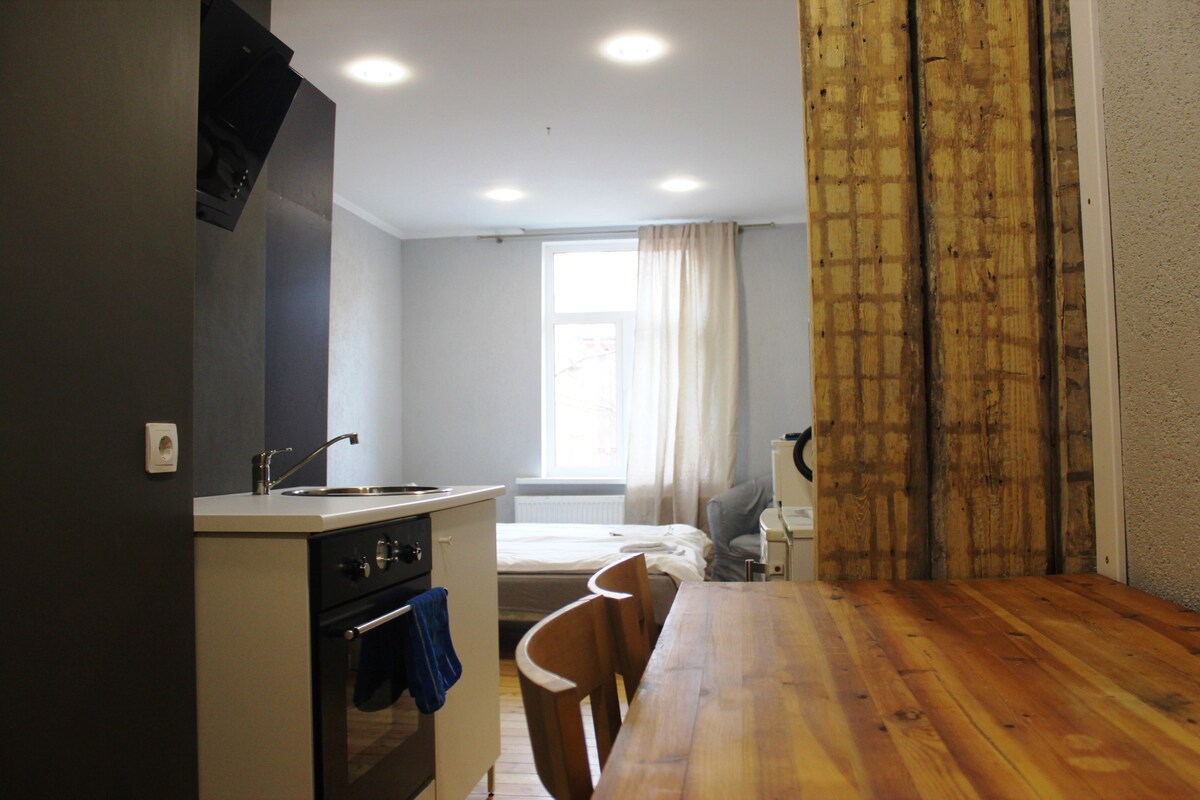 Apartemen Studio ini (18 m2) cocok untuk pelajar, pekerja magang & profesional muda. Tempat ini memiliki furnitur modern, kamar mandi pribadi, dan dapur kecil dengan kulkas, wastafel, dan microwave, namun TANPA KOMPOR. Untuk memasak, Anda bisa menggunakan DAPUR UMUM yang berlokasi di lantai yang sama. Anda juga dapat mengakses ruang cuci swalayan, ruang bersama & pusat kebugaran. Kami memiliki parkir mobil dan sepeda gratis. Apartemen berlokasi di gedung yang baru direnovasi di lantai 4 (tanpa lift).