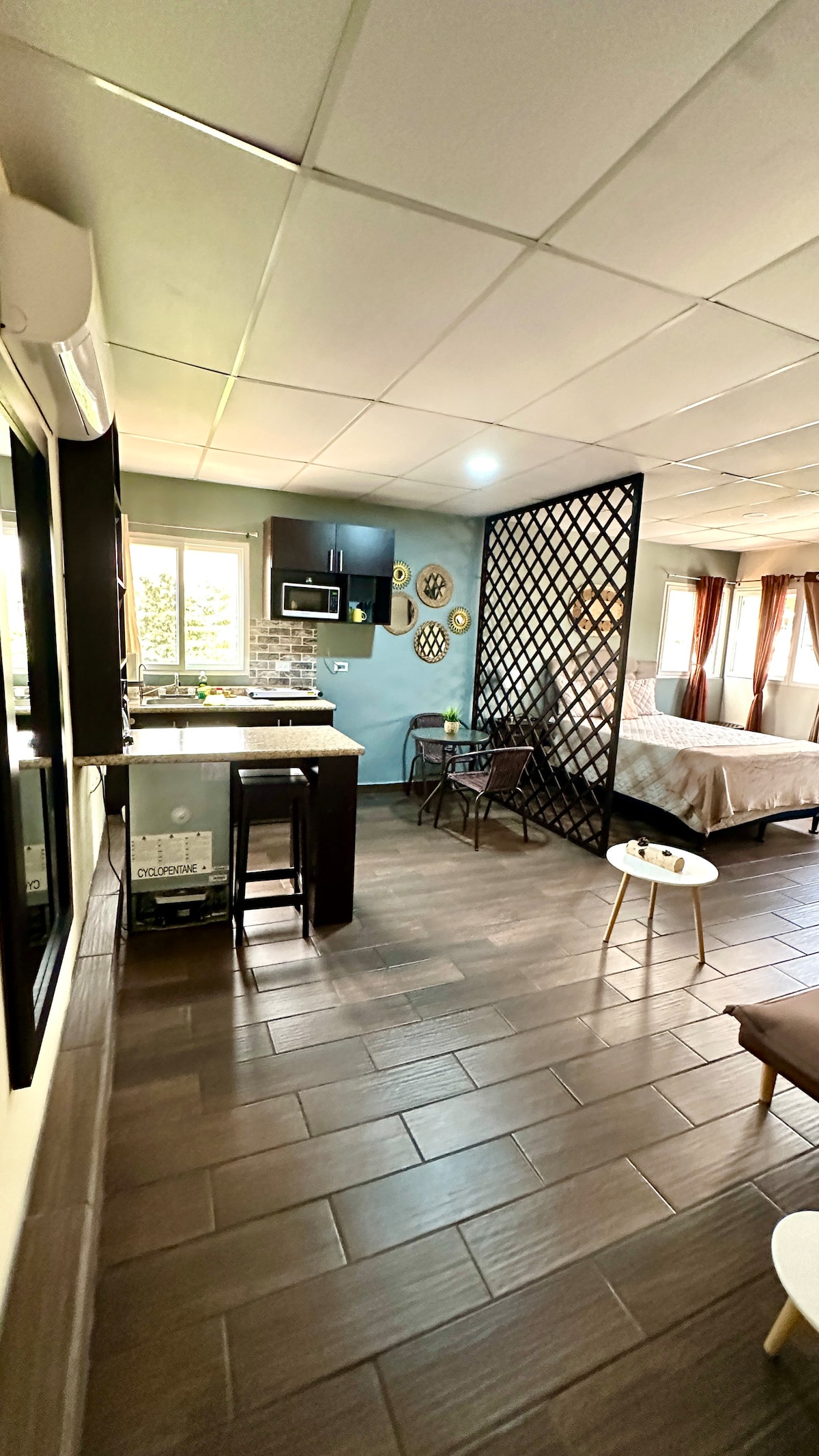 -Contamos con un espacio abierto dotado con todo lo necesario para hacer de tu estadía algo increíble, ideal para 2 personas . Es concepto abierto en el tercer piso con excelente vista a los volcanes. Aire Acondicionado Wifi Cable Smart-TV 43” Cosina equipada con herramientas básicas para cocinar. Te dejamos cafe, aceite, sal y azúcar para estadías cortas. Agua caliente Comedor para dos Cama doble Sofa Cama