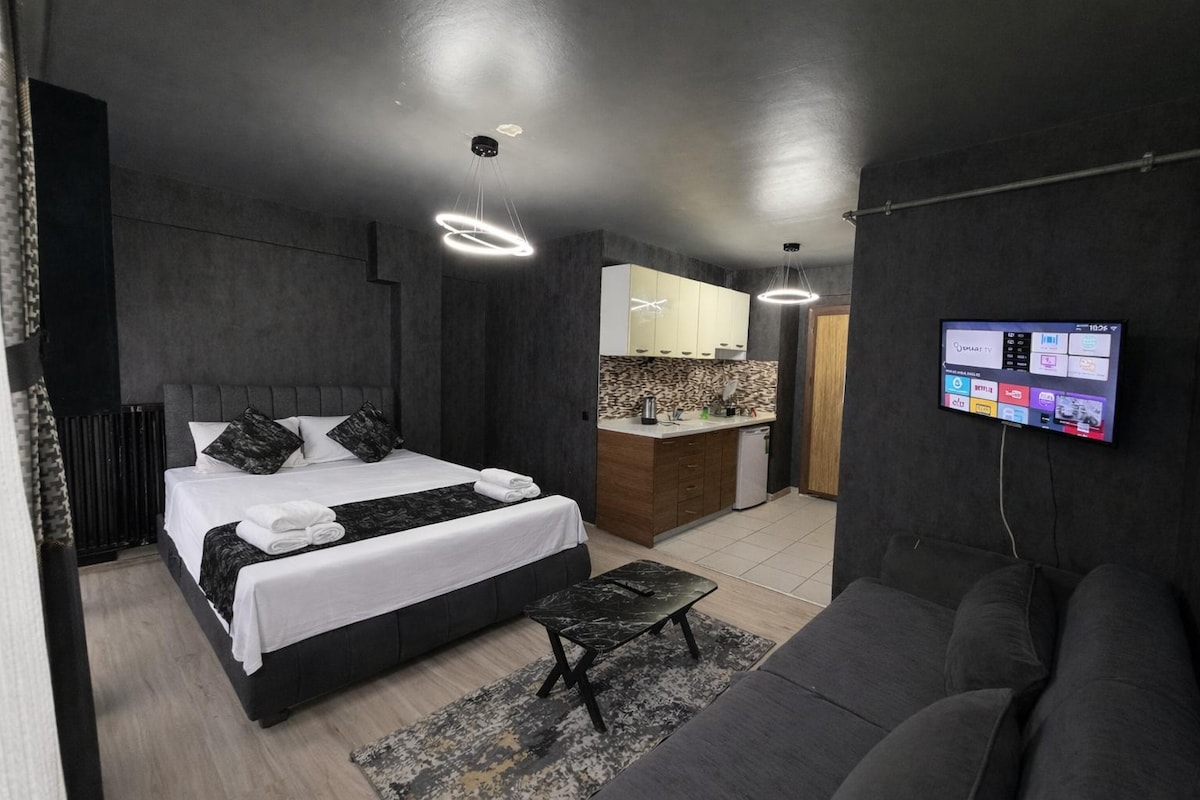 Apartemen 2+1 kami memiliki 1 double full orthopedic bed dan 2 bed single di tengahnya. Dapat menampung hingga 4 orang, 50 layar Android box Netflix tv, konsol game lengan ganda PlayStation4, parkir gratis di jalan. Ada kamera keamanan di luar gedung dan di pintu masuk gedung. Lokasinya bisa ditempuh dengan berjalan kaki ke destinasi mana pun dan sangat dekat dengan transportasi,belanja bahan makanan, dll. Apartemen kami, yang memiliki teh luwak berjarak 50 meter, luas, bergaya, bersih dan memiliki semua peralatan yang diperlukan.