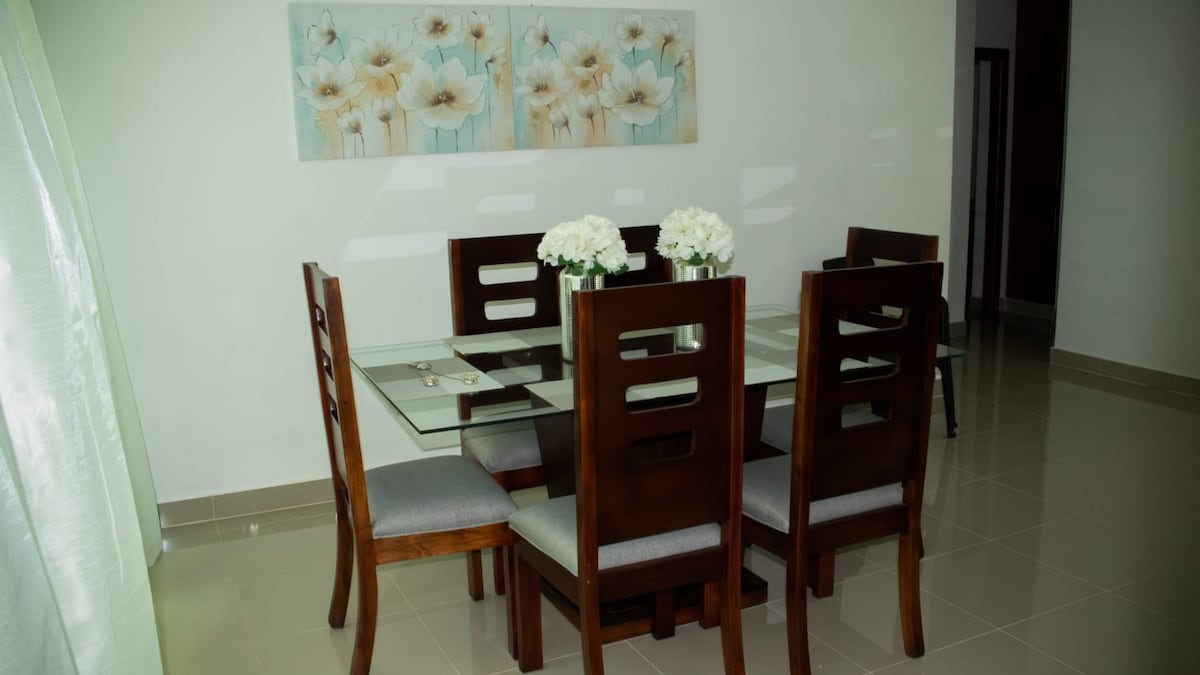 Selamat datang di rumah Anda di Salcedo! Apartemen menawan di lantai 4 ini memiliki tiga kamar yang luas, sangat cocok untuk keluarga atau grup. Nikmati dua kamar mandi modern dan dapur lengkap. Bersantai di balkon dengan pemandangan. Ruang tamu dan ruang makan adalah ruang yang nyaman untuk digunakan bersama. Kami menawarkan internet berkecepatan tinggi, air panas, dan inverter. Cucian mencakup mesin cuci dan pengering. Juga memiliki akses ke taman bermain dan lapangan basket. Apartemen ini ideal untuk liburan yang berkesan.
