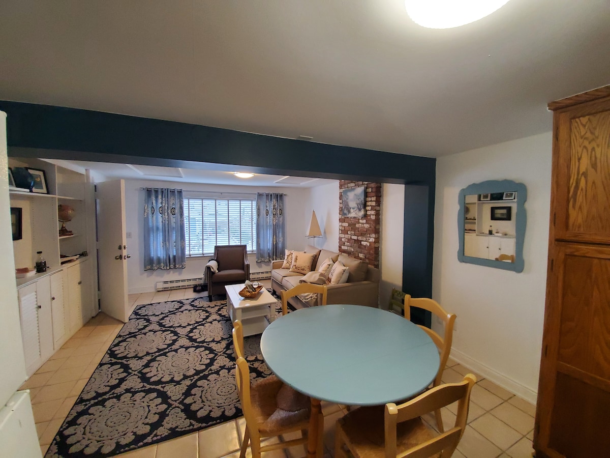 Apartemen lantai dasar 1 kamar tidur yang cerah dan ceria dengan dua+ parkir mobil di jalan yang tenang di lingkungan Ocean Park Marblehead, hanya beberapa langkah dari lautan. Tempat tidur berukuran besar dan sofa pull - out full - size di ruang tamu, kamar mandi pribadi dengan pemanas di lantai, dapur kecil dengan microwave, mesin cuci piring, wastafel, kompor induksi ganda, kulkas, dan oven pemanggang roti. Akses laundry. Berjalanlah ke tepi laut, saksikan perahu layar melayang. Lima belas menit berjalan kaki ke pusat kota bersejarah.