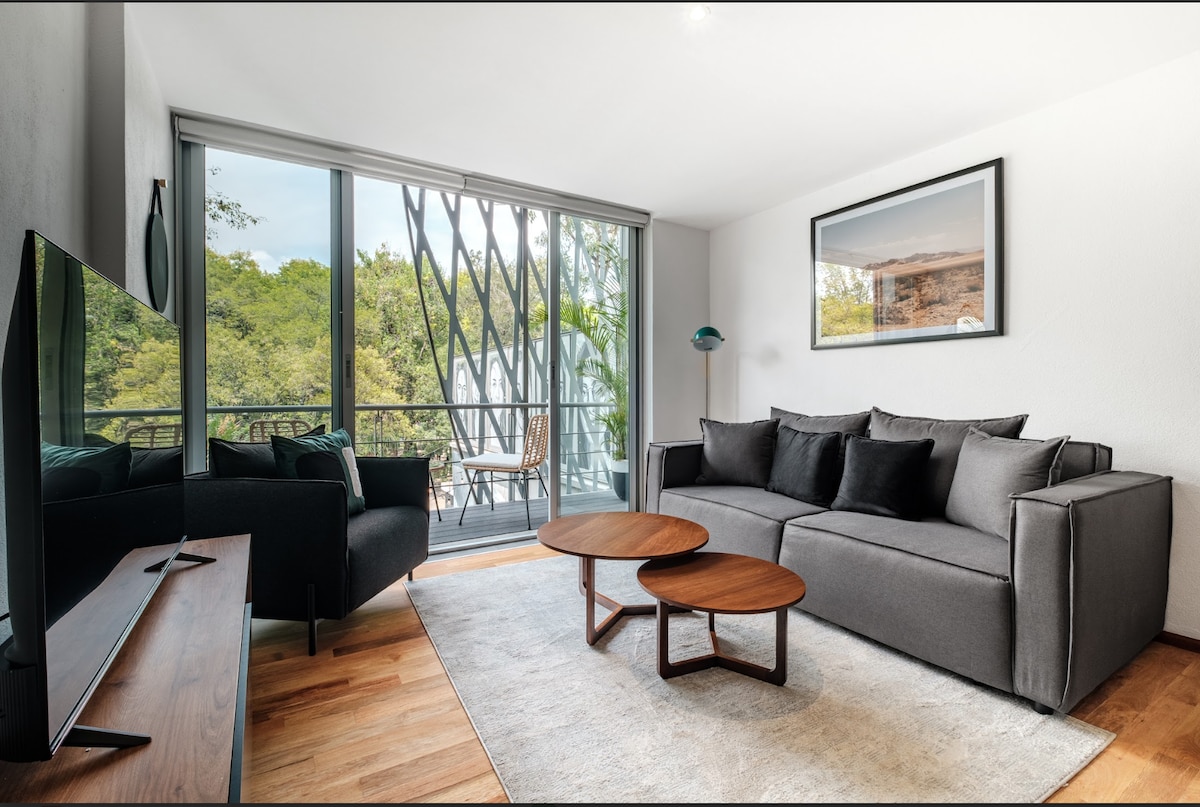 Apartemen kami yang indah mengapung di atas pepohonan lebat di jalan La Condesa yang paling indah dan tenang, di sebuah bangunan modernis bergaya yang dirancang oleh Javier Sanchez, salah satu arsitek terbaik dan terkenal di Meksiko. Sinar matahari membanjiri apartemen sepanjang hari, dan Anda bisa menikmati matahari terbenam di teras pribadi kami yang indah. Ambil buku, atau minuman atau keduanya dan nikmati matahari sore di kursi santai Acapulco kami yang nyaman dikelilingi oleh tanaman hijau.